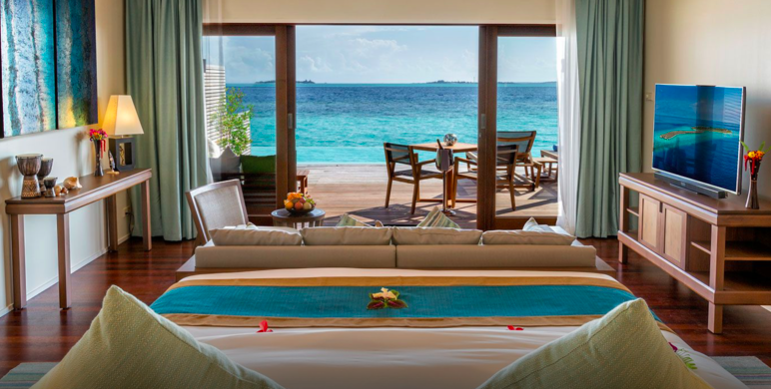 1. Ocean Villas ห้องกลางน้ำแบบเริ่มต้นที่ห้องกว้างขวาง ขนาด 105 ตารางเมตร ห่อง type นี้ไม่มีสระว่ายน้ำที่ระเบียง แต่สามารถนั่งเก้าอี้ชายหาดมองออกไปจากห้องพักจะเห็นทะลที่สวยงามของประเทศมัลดีฟส์ยิ่งมองยิ่งไม่อยากจะละสายตา หรือจะลงว่ายน้ำทะเลจากทางด้านหน้าของห้องก็สามารถทำได้ค่ะ
