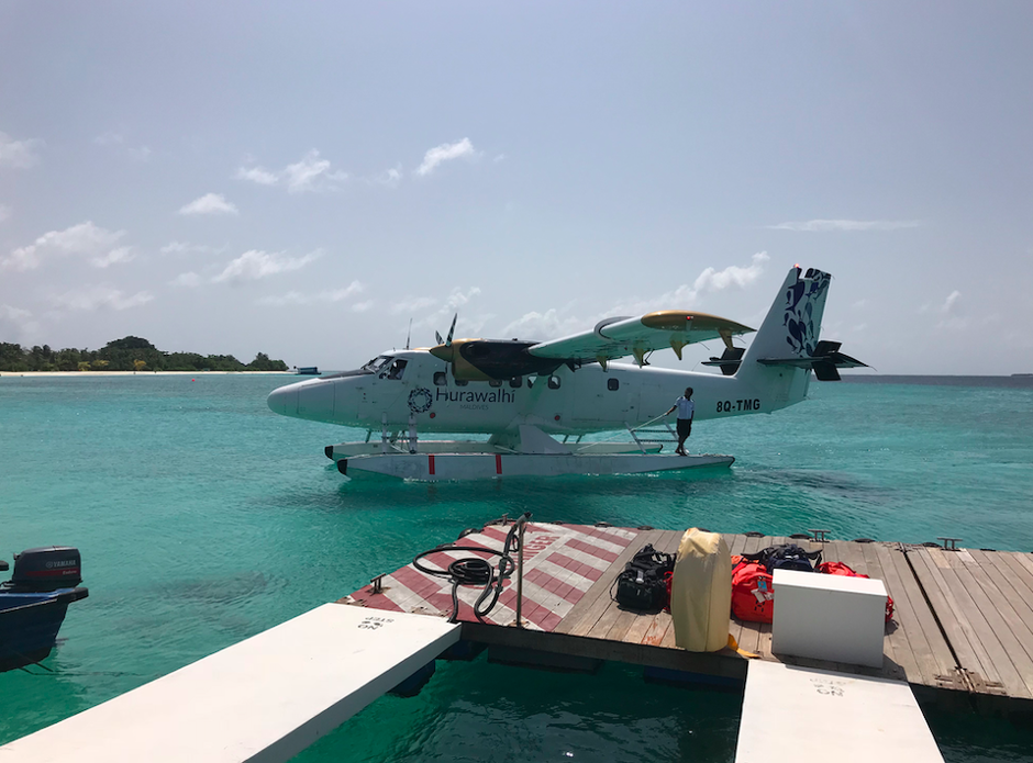 ในการเช็คอิน seaplane เจ้าหน้าที่จะขอ passport ของผู้เดินทางทุกท่าน เจ้าหน้าที่ seaplane จะทำการชั่งน้ำหนักกระเป่าทุกใบ ซึ่งกระเป๋าใบที่จะโหลดไม่ควรเกิน 20 กิโลกรัม และกระเป๋า Carry on จะหนักไม่เกิน 5 กิโลกรัมต่อท่าน หากเกินจะมีค่าใช้จ่ายเพิ่มเติมค่ะ กระเป๋าที่โหลดจะถูกนำไปไว้ที่หลังของ Seaplane ผู้เดินทางทุกท่านจะได้รับ boarding pass เพื่อใช้ในการขึ้น seaplane ต้องเก็บเอาไว้ให้ดีค่ะ หลังจากนั้นเจ้าหน้าที่จะให้ขึ้นรถBusไปที่ Seaplane Terminal เนื่องจาก HURAWALHI ISLAND RESORT เป็นรีสอร์ท 5 ดาวจึงมี Lounge ให้บริการ ระหว่างรอเจ้าหน้าที่จะให้กรอกเอกสารในการเช็คอิน เพื่อไม่ให้เสียเวลา ภายใน loungeจะมีอาหารว่างและเครื่องดื่มให้บริการ รวมถึง Free Wifi ค่ะ เวลาในการรออาจจะ 30 นาที – 2 ชั่วโมง ทั้งนี้ขึ้นอยู่กับการจัดการของบริษัท seaplane และสภาพอากาศในวันนั้นๆ เมื่อพร้อมออกเดินทาง เจ้าหน้าที่จะมาเรียกให้เตรียมตัวไปขึ้น seaplane เจ้าหน้าที่จะเช็ค boarding pass เพื่อกันการผิดพลาด เมื่อพร้อมแล้วเจ้าหน้าที่จะนำท่านไปยัง seaplane ที่จะบินไปที่ HURAWALHI MALDIVES RESORT ซึ่งใครขึ้น seaplane ก่อนก็สามารถเลือกที่นั่งได้ก่อนค่ะ โดยทั่วไปด้านขวาจะเป็นแบบ 2 ที่นั่งและด้านซ้ายจะเป็น 1 ที่นั่ง รวมทั้งหมด 15 ที่นั่ง ภายใน seaplane จะไม่มีแอร์ ในวันที่อากาศร้อน ก่อนเครื่องขึ้นอาจรู้สึกร้อนสักหน่อย แต่เมื่อเครื่องบินบินขึ้นจะรู้สึกเย็นขึ้น เพราะจะมีลมจากภายนอกเข้ามาค่ะ Seaplane จะบินขึ้นทางเหนือของประเทศมัลดีฟส์ หากบินตรงไปยัง HURAWALHI MALDIVES RESORT จะใช้เวลาประมาณ 40 นาที แต่หากแวะรีสอร์ทอื่นก่อนก็จะใช้เวลาเพิ่มขึ้น ตอนทีมงานได้ไปที่รีสอร์ท HURAWALHI MALDIVES RESORT Seaplane ไม่จอดที่แพของรีสอร์ทเนื่องจากสภาพอากาศไม่อำนวย แต่ไปจอดที่รีสอร์ทใกล้เคียง แล้วจะมีเรือ speedboat กับเจ้าหน้าที่มารอรับค่ะ ใช้เวลาไม่นานก็มาถึงยังท่าเรือของ HURAWALHI MALDIVES RESORT เจ้าหน้าที่ของรีสอร์ทหลายๆท่านจะมาให้การต้อนรับและพาไปยัง reception เพื่อทำการ check in โดยเวลาในการ check in จะเป็น 14.00 น. แต่หากมาถึงก่อนเวลาและมีห้องว่าง ทางรีสอร์ทอาจจะให้เข้าพักได้ก่อนค่ะ เมื่อมาถึง reception เจ้าหน้าที่จะเสิร์ฟ welcome drink และผ้าเย็นให้ระหว่างที่เจ้าหน้าลงทะเบียนการเข้าพักให้ เมื่อพร้อมจะได้รับการ์ดเข้าห้องพักและแผนที่ของรีสอร์ท เจ้าหน้าที่จะอธิบายรายละเอียดเกี่ยวกับรีสอร์ท meal plan ที่ได้เลือกมาว่าครอบคลุมอะไรบ้าง เมื่อถึงเวลาเจ้าหน้าที่รีสอร์ทจะพาไปส่งยังห้องพักที่เลือกไว้ค่ะ