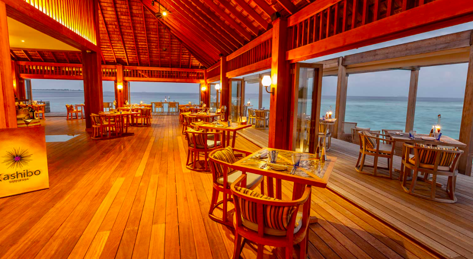 3. ห้องอาหาร KASHIBO and BAR ตั้งอยู่ติดกับห้องอาหาร 5.8 UNDERSEA เป็นห้องอาหาร open air ติดทะเลที่สามารถมองออกไปเห็นมหาสมุทรที่สวยงามของประเทศมัลดีฟส์ที่นั่งรับประทานมีทั้งภายใต้อาคารและพื้นที่ด้านนอกอาคาร อาหารที่ให้บริการเป็น Fusion Asian Cuisine จากจีน ไทย เวียดนามและอินโดนีเซียให้ได้ลองกัน นอกจากนี้ยังสามารถดื่มเครื่องดื่มแบบมีและไม่มีแอลกอฮอลล์ที่แสนชื่นใจไปด้วยค่ะ