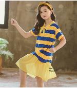 เด็กโต-เดรสแขนสั้นลายริ้วสีเหลือง-น้ำเงินผูกริบบิ้นชีฟองและชายต่อระบายไซส์ 150 รหัสKKL067A