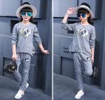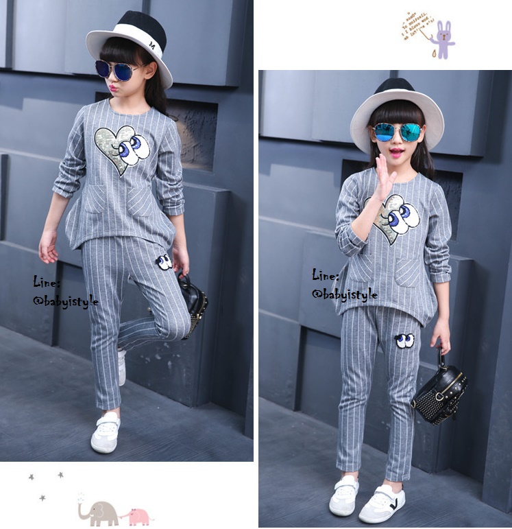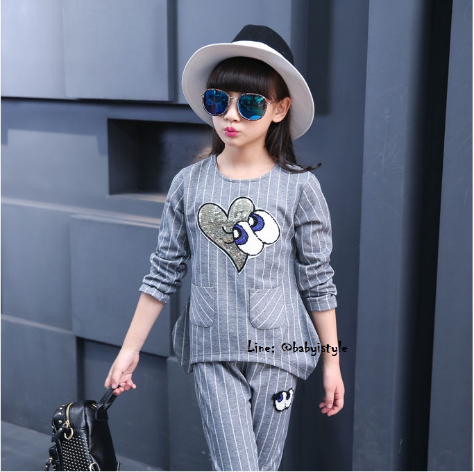 เด็กโต-ชุด2ชิ้นเสื้อแขนยาวสีเทาลายริ้วติดเหลื่อมรูปหัวใจตาปิ๊งๆ