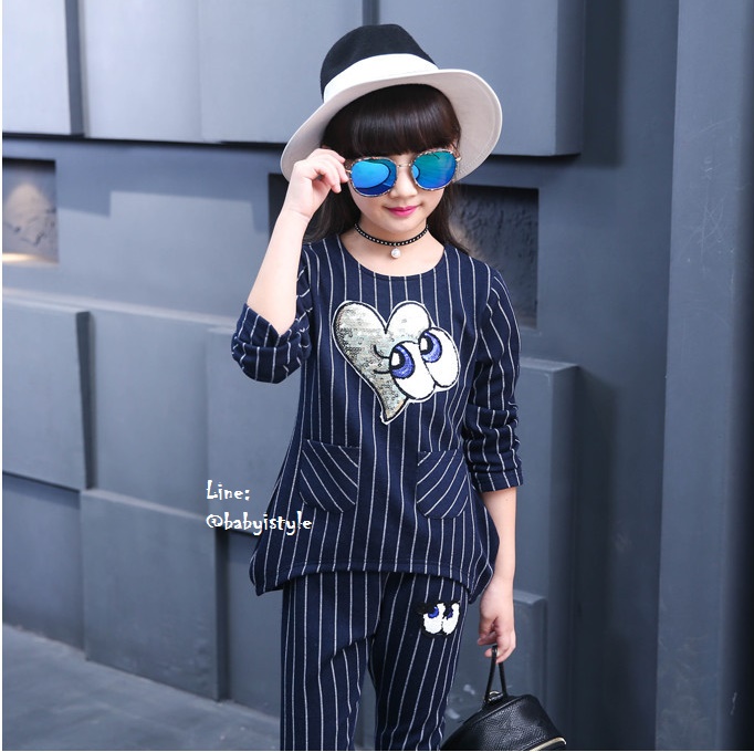 เด็กโต-ชุด2ชิ้นเสื้อแขนยาวสีกรมท่าลายริ้วติดเหลื่อมรูปหัวใจตาปิ๊งๆ