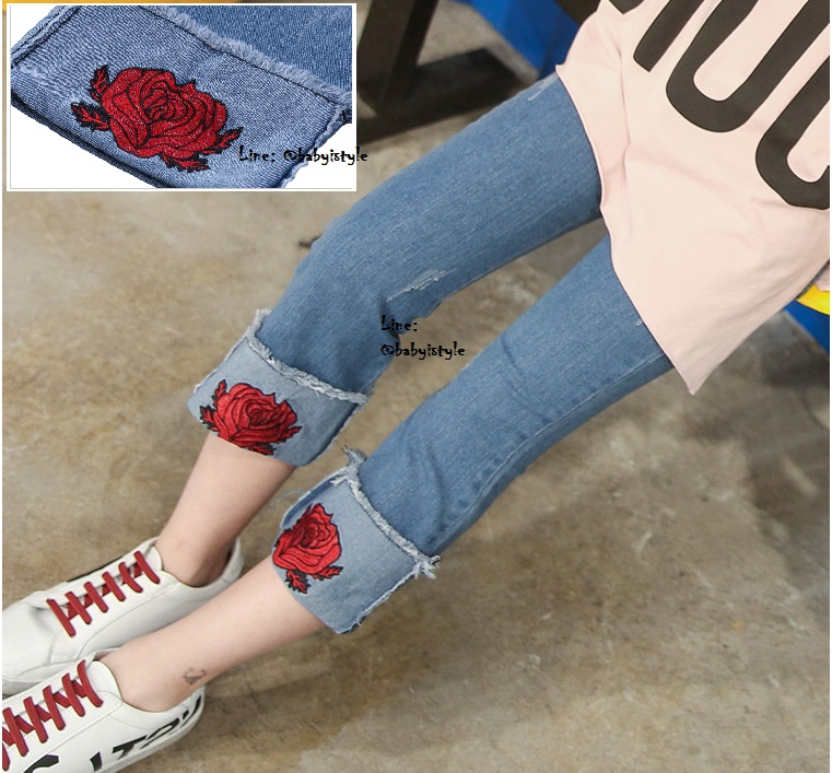*Sales เด็กโต-กางเกงยีนส์ 4 ส่วนพับเบิ้ลปักดอกกุหลาบแดง ไซส์ 150 รหัส KKK709