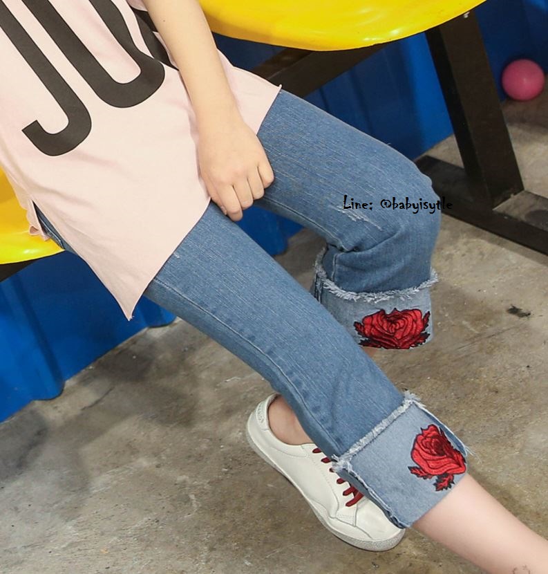 เด็กโต-กางเกงยีนส์ 4 ส่วนพับเบิ้ลปักดอกกุหลาบแดง