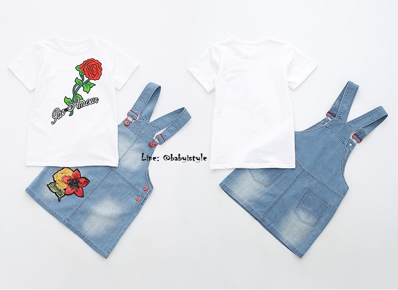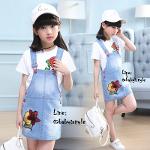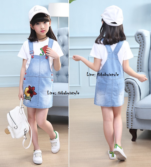 เด็กโต-เฉพาะเอี๊ยมกระโปรงยีนส์เทียม(บาง) ปักดอกไม้แดง มีกระเป๋าหลัง สายปรับได้ งานสวยน่ารัก
