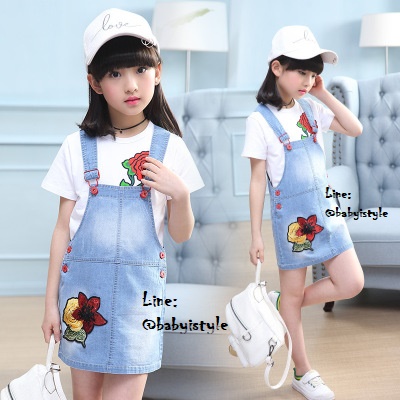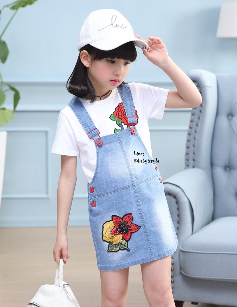 เด็กโต-เฉพาะเอี๊ยมกระโปรงยีนส์เทียม(บาง) ปักดอกไม้แดง มีกระเป๋าหลัง สายปรับได้ งานสวยน่ารัก ไซส์ 140/150/160