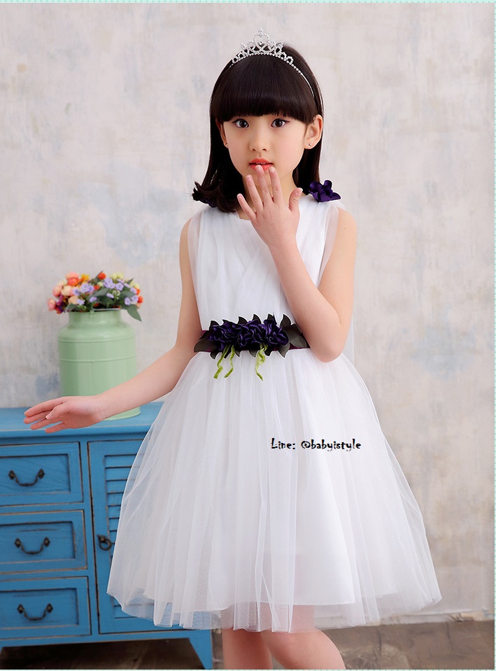 เด็กโต-เดรสออกงานแขนกุดสีขาว เอวแต่งดอกไม้สีม่วงผูกริบบิ้นหลัง ราคา 590 พิเศษ 410 บาท*ไม่รวมค่าส่ง
