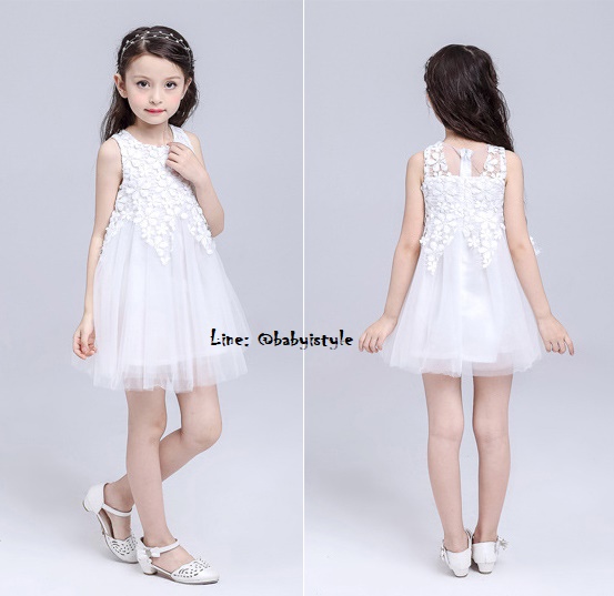 เด็กโต-เดรสแขนกุดสีขาว ช่วงเสื้อติดลูกไม้สีขาว กระโปรงผ่าตาข่าย มีซับในและซิปหลัง งานสวยเริ่ด