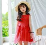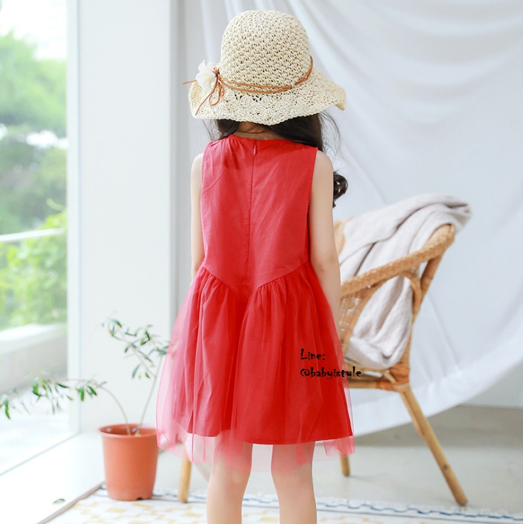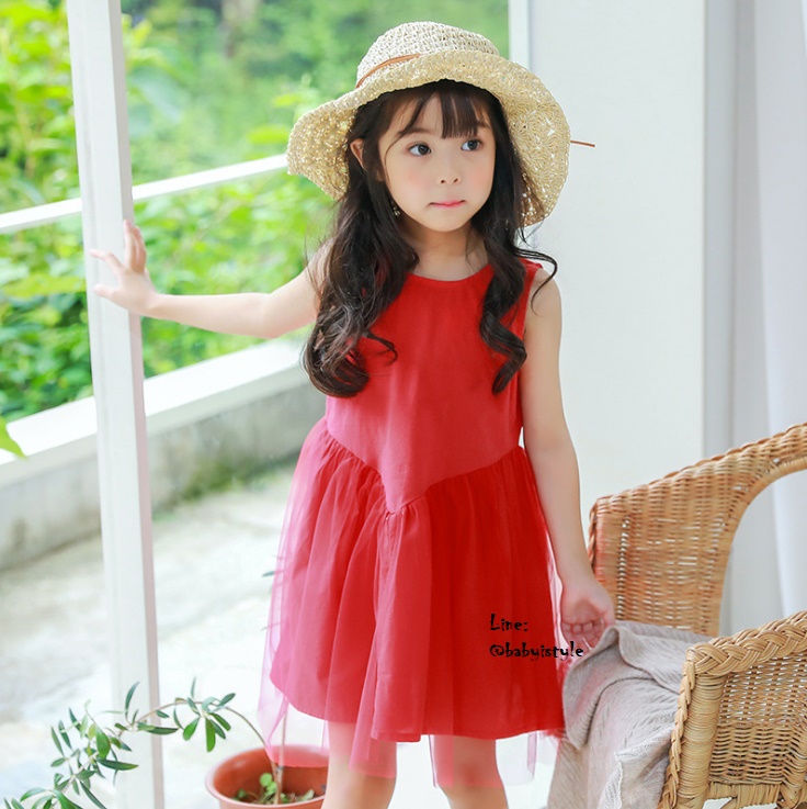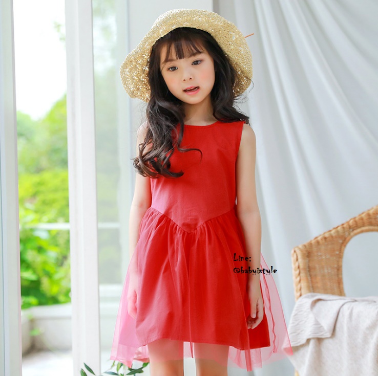 เด็กโต-เดรสพรีเมี่ยมแขนกุดสีแดง ซ้อนผ้าตาข่ายด้านนอกช่วงกระโปรง ผ้าคอตตอน มีซิปหลัง งานสวยน่ารัก