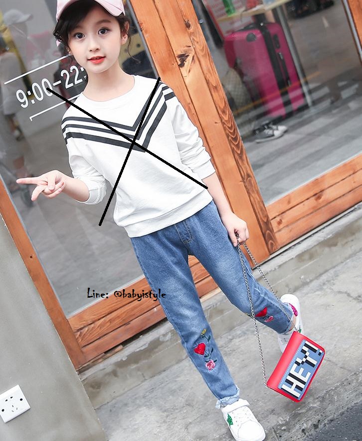 เด็กโต-กางเกงยีนส์ขายาวพับเบิ้ลชายปล่อย ปักดอกไม้ เอวยางยืด มีกระเป๋าหลัง งานสวยเก๋
