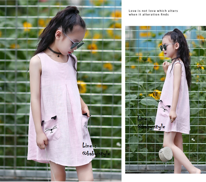 เด็กโต-เดรสแขนกุดสีชมพูทรงเอ มีกระเป๋าหน้าแมวเหมียว ติดกระดุมหลัง ผ้าลินินผสม งานสวยเริ่ด ไซส์ 140/150/160