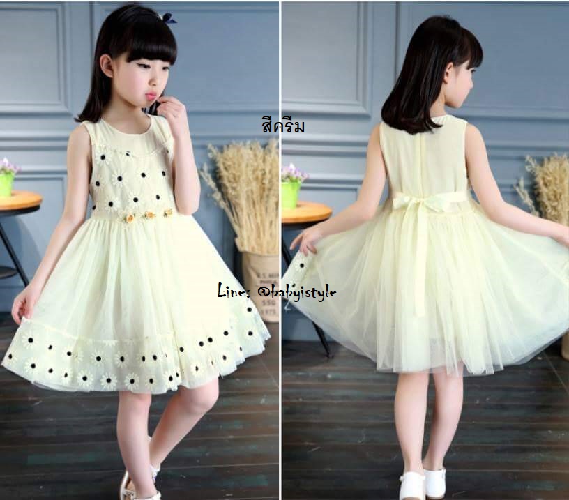 เด็กโต-เดรสแขนกุดสีครีมปักลายดอกทานตะวัน ผูกริบบิ้นหลังสีครีม กระโปรงผ้าตาข่าย2ชั้น มีซับในทั้งชุด ซิปหลัง