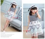 เด็กโต-ชุด 3 ชิ้นเดรสแขนกุดลายริ้วสีกรม-ขาวต่อกระโปรงผ้าแก้วปักดอกไม้โทนสีฟ้า+หมวกสีขาว+ติดเข็มกลัด