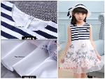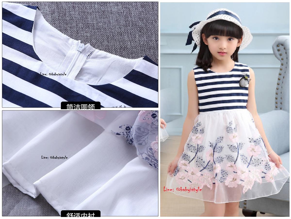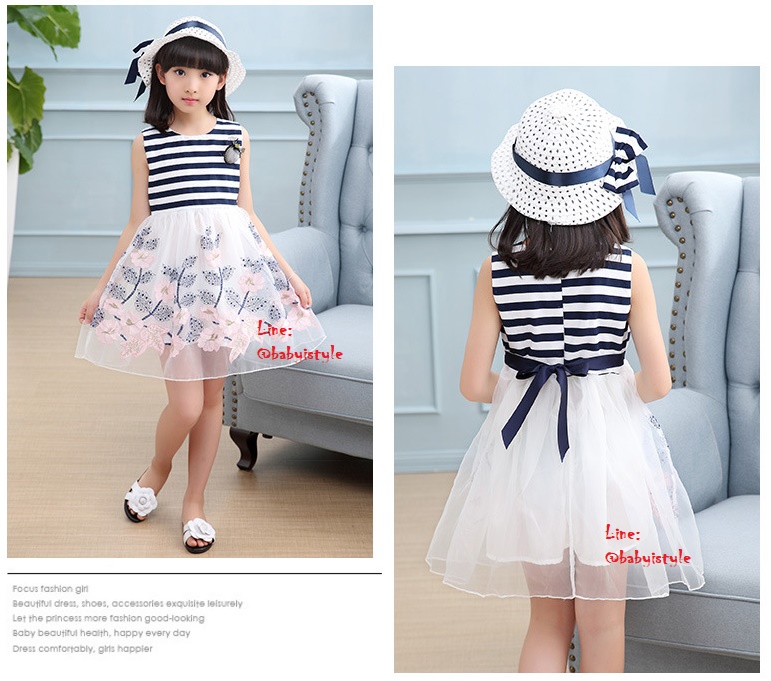 เด็กโต-ชุด 3 ชิ้นเดรสแขนกุดลายริ้วสีกรม-ขาวต่อกระโปรงผ้าแก้วปักดอกไม้โทนสีชมพู+หมวกสีขาว+ติดเข็มกลัด