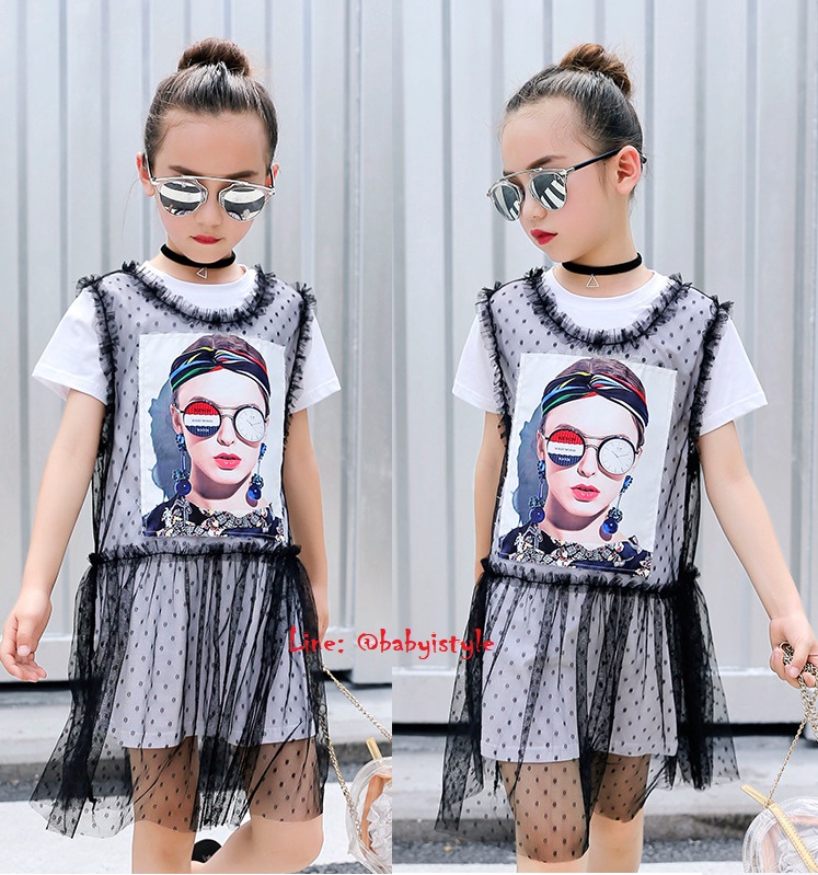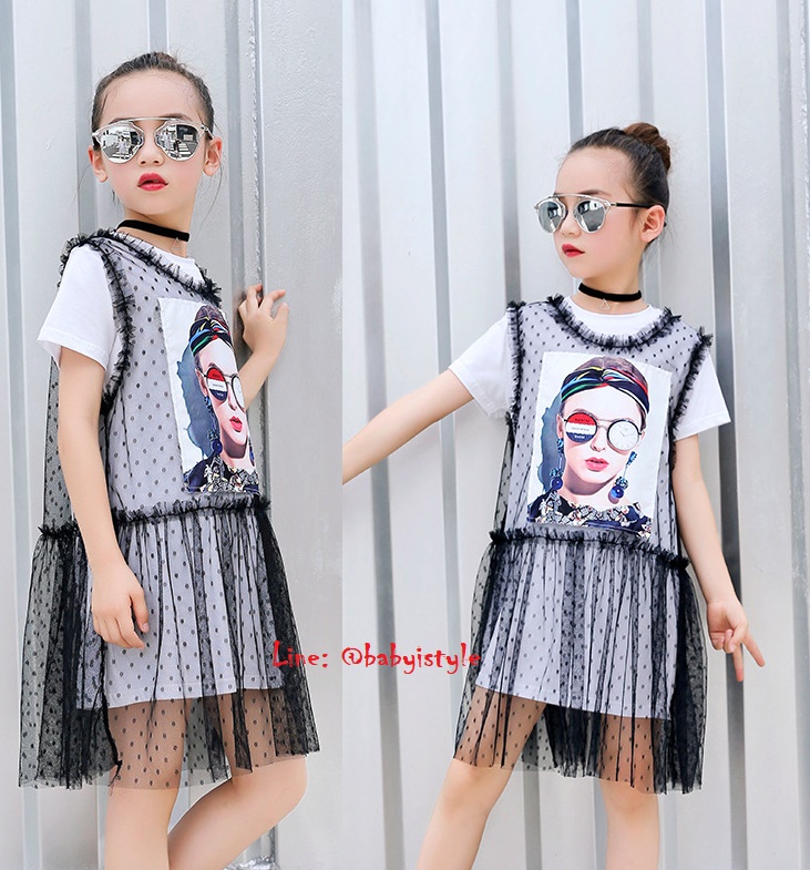 เด็กโต-ชุด2ชิ้นเดรสแขนสั้นสีขาวCOURAGE+เดรสผ้าตาข่ายสีดำปักรูปสาวเปรี้ยว งานสวยน่ารักชิคๆ