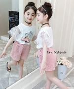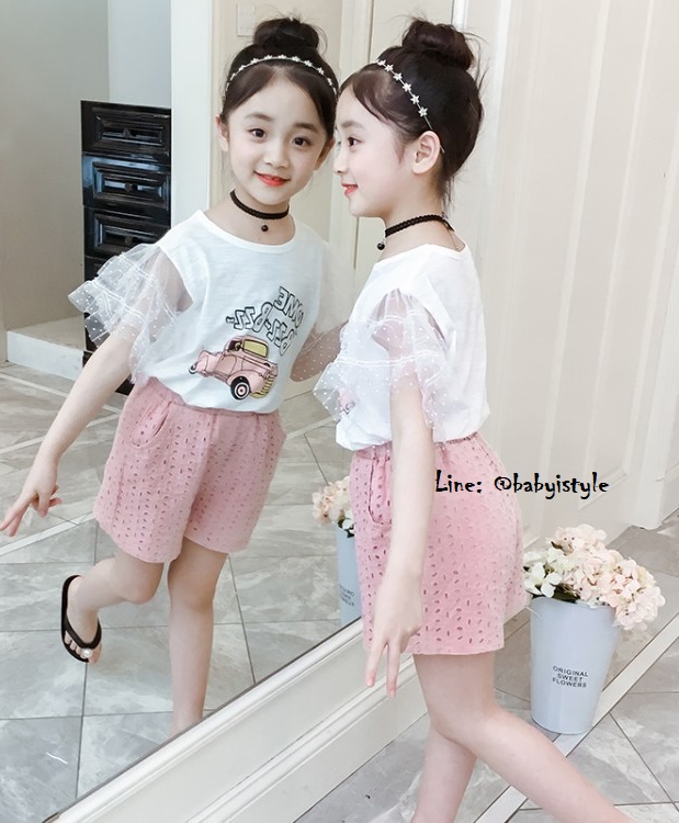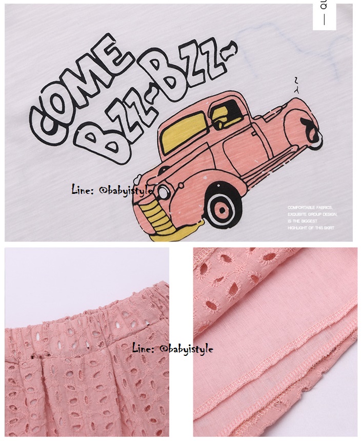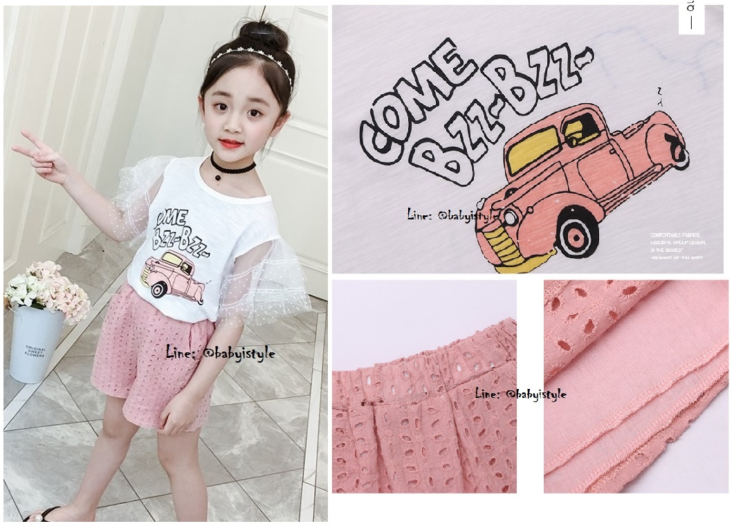 เด็กโต-ชุด2 ชิ้นเสื้อยืดสีขาวแขนฟรุ๊งฟริ๊งลายรถCOME BZZ-BZZผ้าสลาฟ+กางเกงขาสั้นฉลุสีชมพู เอวยางยืด มีซับไน มีกระเป๋าข้าง ผ้าคอตตอน งานสวยน่ารักค่ะ ไซส์ 140/150/160