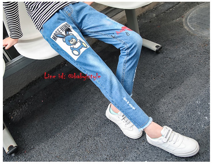 เด็กโต-กางเกงยีนส์ขายาวเดฟสกรีนหมี สกิดขาดนิดๆ ชายปล่อย เอวยางยืด มีกระเป๋าหน้า-หลัง งานสวยเก๋ (ผ้าไม่ยืดนะค่ะ)