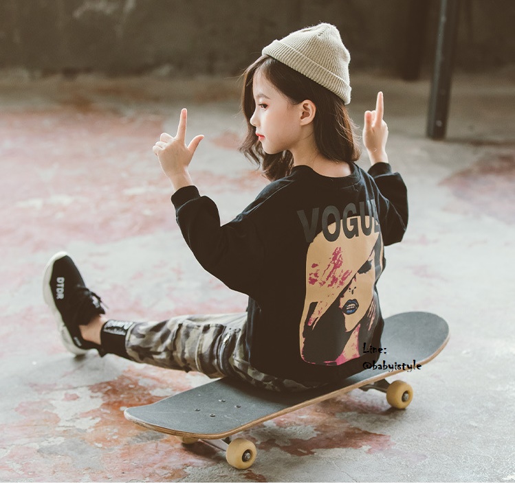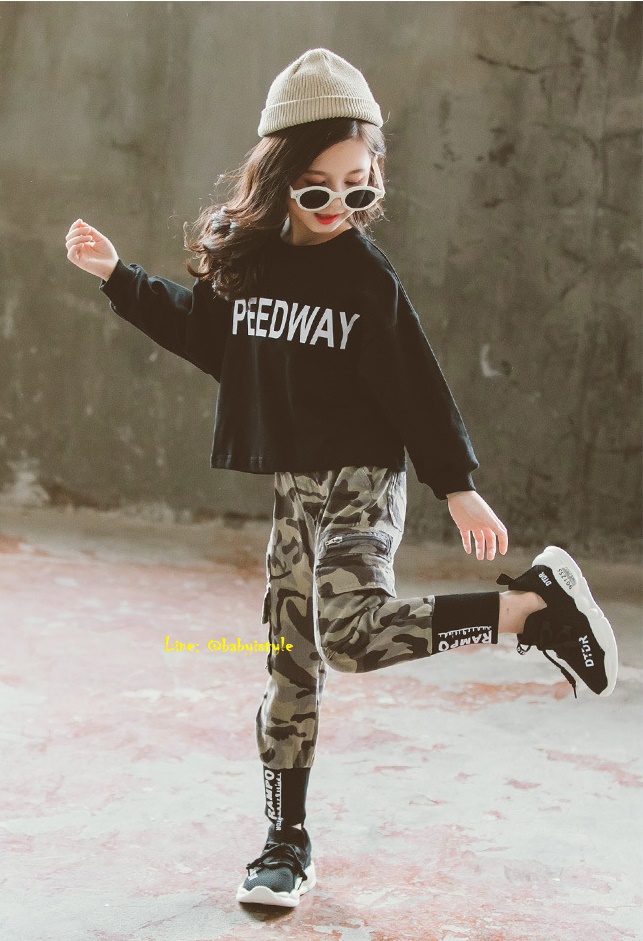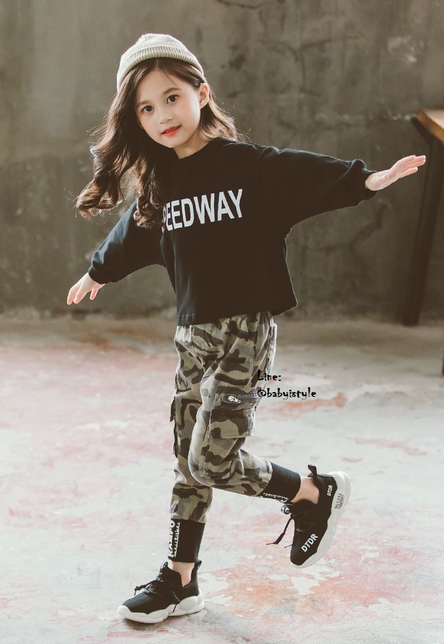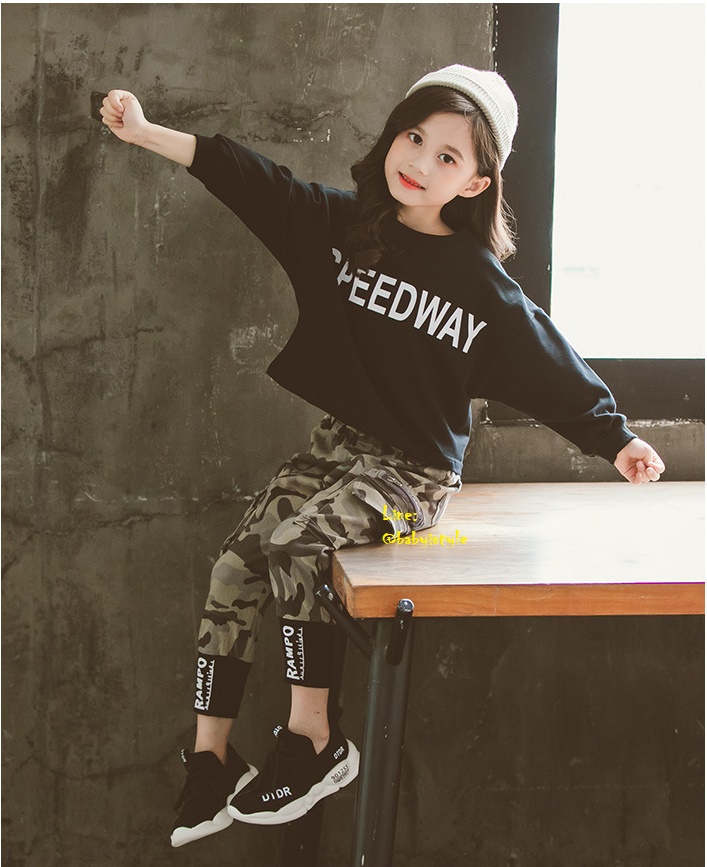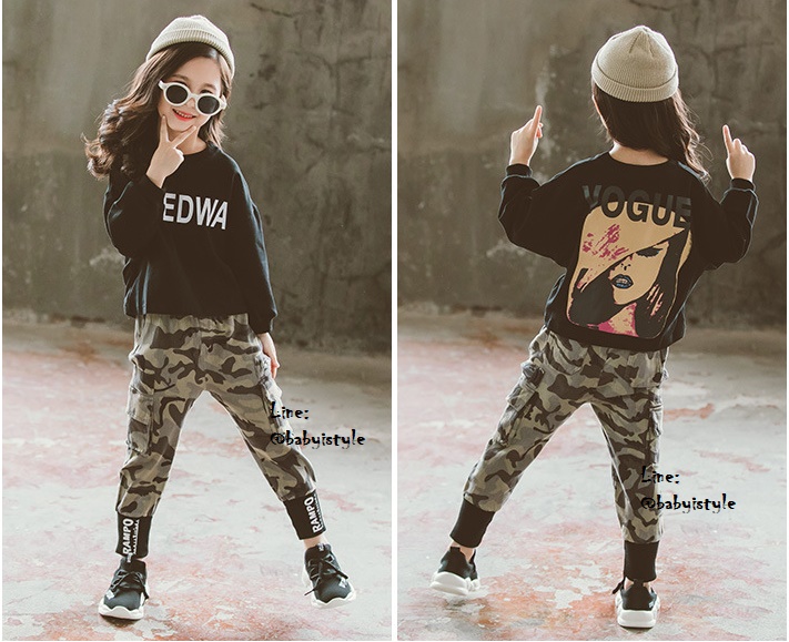 เด็กโต-ชุด2 ชิ้นเสื้อแขนยาวจั๊มพ์สีดำSPEEDWAY หลังสกรีนVOGEUชายปล่อย+กางเกงขายาวจั๊มพ์ลายพรางสีเขียว มีกระเป๋าข้าง เอวยางยืด งานสวยเท่ห์ค่ะ ไซส์140/150/160