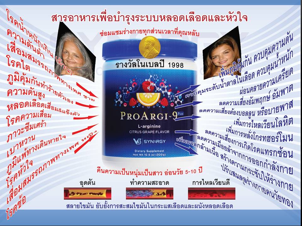 ผลิตภัณฑ์เสริมอาหาร กรดอะมิโน แอล-อาร์จินีน (L-Arginine) รูปแบบผง สกัดจากผลทับทิม (Pomegranate) สารสกัดเข้มข้นจากผิวองุ่น (Grape Skin Extract) มีรสหวานจากไซลิทอล และซูคราโรส ประกอบด้วยวิตามิน 4 ชนิด ( วิตามินบี 6, บี 12, เค 12, ดี 3) กรดโฟลิก ช่วยเสริมสร้างระบบการไหลเวียนของร่างกาย โดยเฉพาะด้านระบบหลอดเลือดและหัวใจ สร้างเสริมการสร้างโกรทฮอร์โมนตามธรรมชาติ ไม่มีสีสังเคราะห์ และวัตถุกันเสีย 1 ช้อนตวง ให้แอล-อาร์จินีน (L-Arginine) 5 กรัม