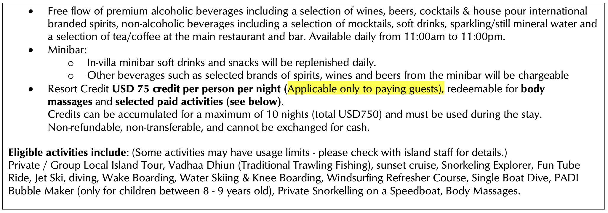 • Complimentary use of Vilu Business Lounge on arrival at Seaplane terminal including WIFI, F&B services