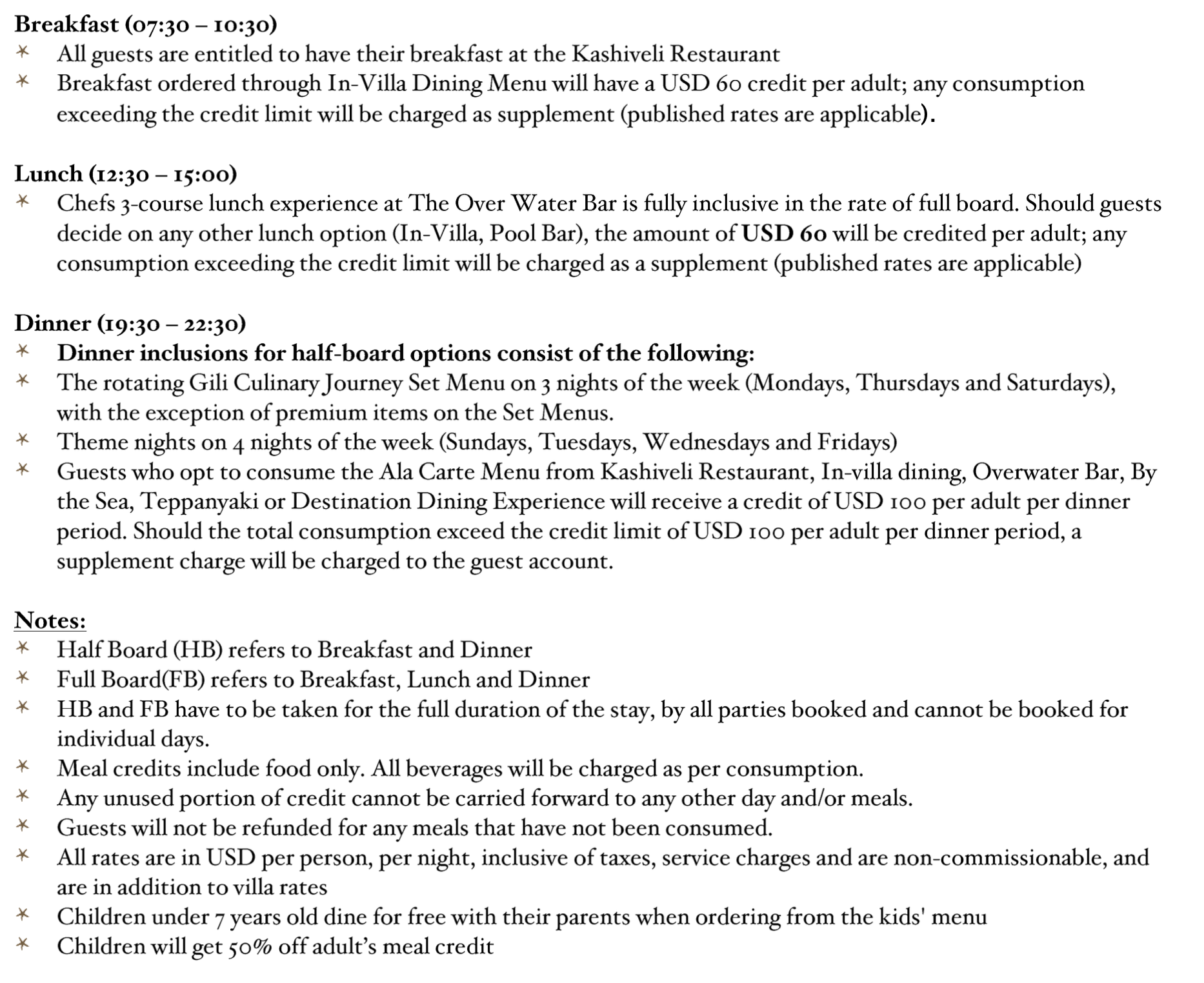 ราคาพิเศษนี้สำหรับการจองขั้นต่ำ 2 คืน/ This special price is for 2 nights minimum stays. ราคานี้ เป็นราคาต่อท่าน เดินทางเข้าพัก 2 ท่าน ต่อห้อง / Price per person base on twin sharing basic. ราคาข้างต้นเป็นราคา ณ ปัจจุบัน หากมีโปรโมชั่นใหม่ไม่สามารถ re-book ได้ ราคาข้างต้นเป็นราคาตามอัตราแลกเปลี่ยน ณ ปัจจุบัน หากมีการเปลี่ยนแปลงของอัตราแลกเปลี่ยนในอัตราที่สูง ณ ช่วงเวลาที่ทำการจอง บริษัทฯ ขอสงวนสิทธิ์ในการเปลี่ยนแปลงราคา ราคาข้างต้นคำนวณจากราคาและอัตราภาษีของประเทศมัลดีฟส์ ณ อัตราปัจจุบัน ( GST และภาษีอื่นๆ) ซึ่งอาจจะมีการผันแปรหรือเปลี่ยนแปลงตามการเปลี่ยนแปลงของรีสอร์ทได้ PACKAGES INCLUDE: