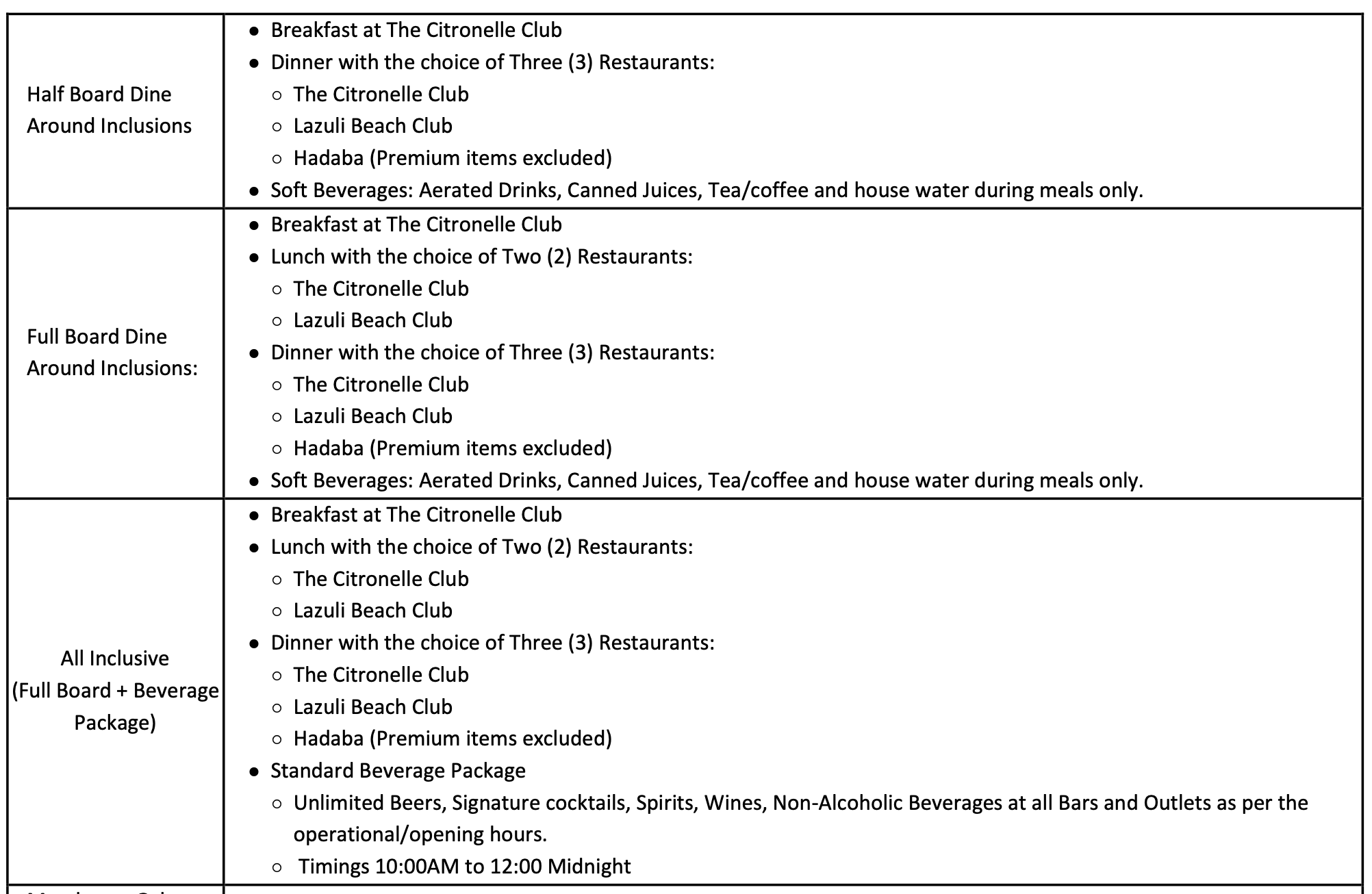 ALL INCLUSIVE PLAN (FULL BOARD + STANDARD BEVERAGE PACKAGE) | |||||