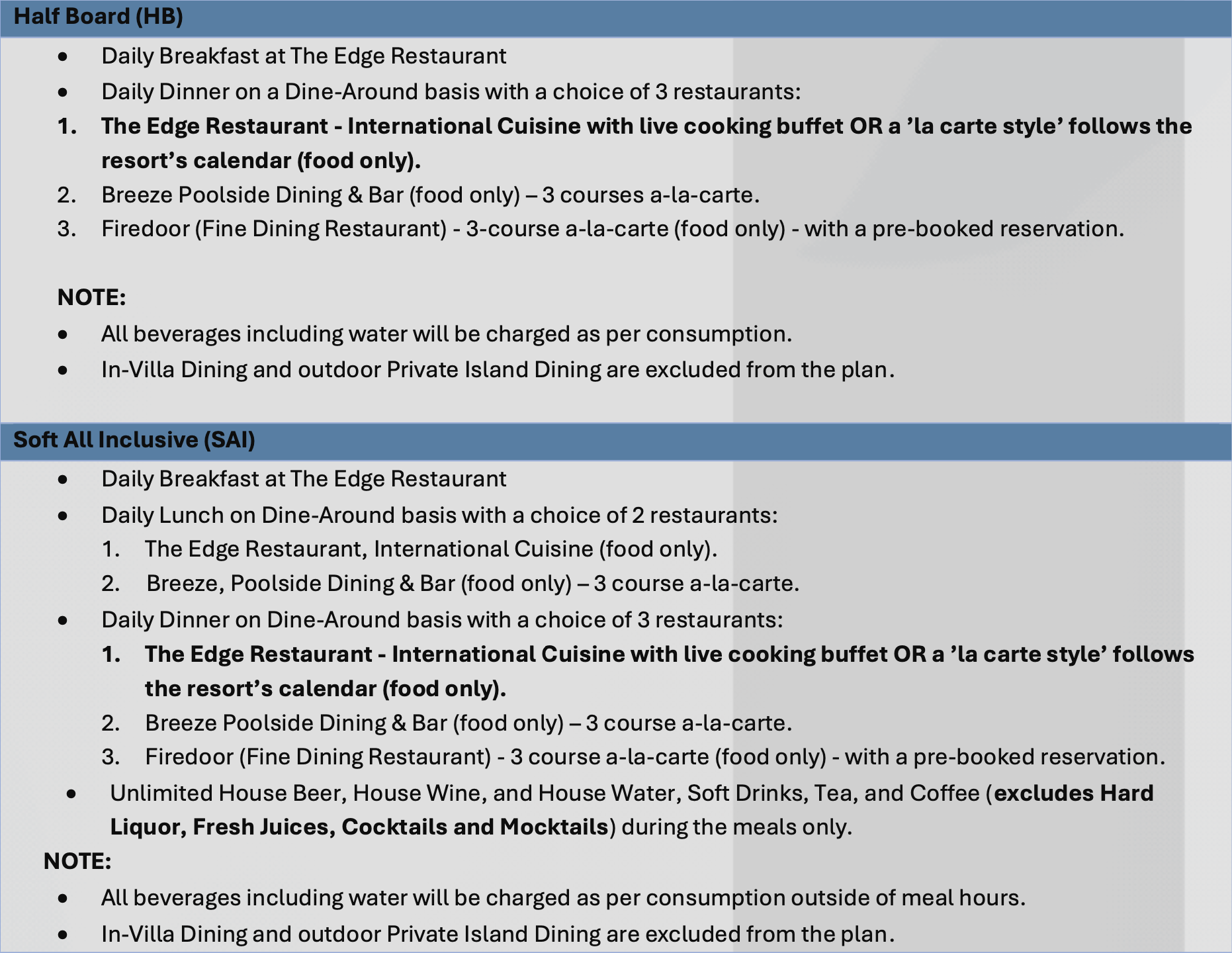 • ราคาข้างต้นคำนวณจากราคาและอัตราภาษีของประเทศมัลดีฟส์ ณ อัตราปัจจุบัน (GST และภาษีอื่นๆ) ซึ่งอาจจะมีการผันแปรหรือเปลี่ยนแปลงตามการเปลี่ยนแปลงของรีสอร์ทได้/ This price is included current Maldives taxes, if there's any changes of Maldives taxe rates, we reserve the right to change the prices.