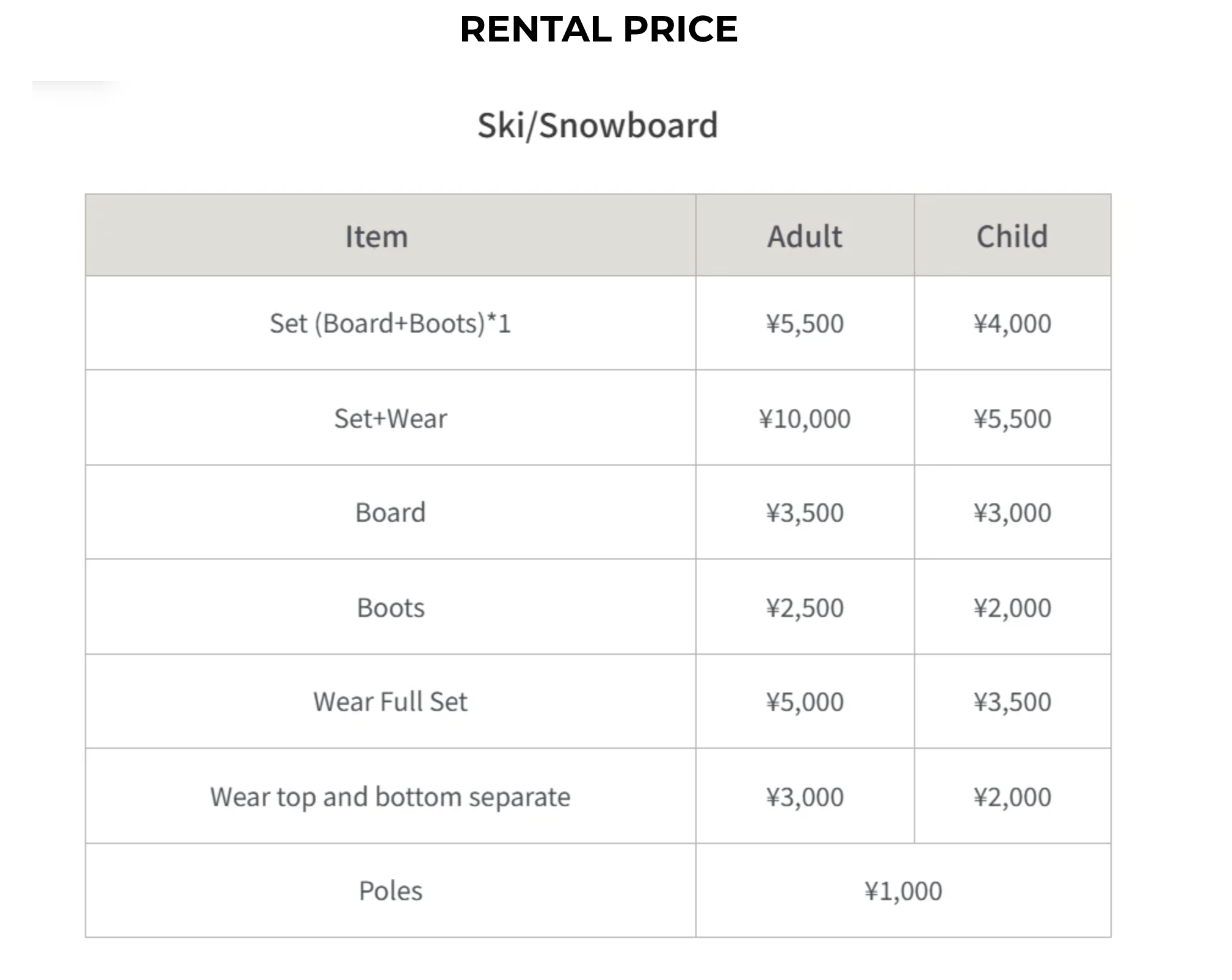 ค่าเช่าอุปกรณ์ Ski และ Snowboard