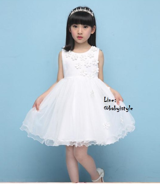 เด็กโต-เดรสออกงานแขนกุดสีขาว มีริบบิ้นผูก มีซิปหลัง กระโปรงแต่งดอกไม้และมุก ซ้อนผ้าตาข่าย(นุ่ม) มีซับในทั้งตัว งานสวยเริ่ดมากๆ ไซส์ 140/150/160