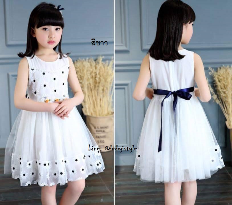 เด็กโต-เดรสแขนกุดสีขาวปักลายดอกทานตะวัน ผูกริบบิ้นหลังสีกรมท่า กระโปรงผ้าตาข่าย2ชั้น มีซับในทั้งชุด ซิปหลัง งานสวยน่ารักมาก ไซส์ 140/150/160