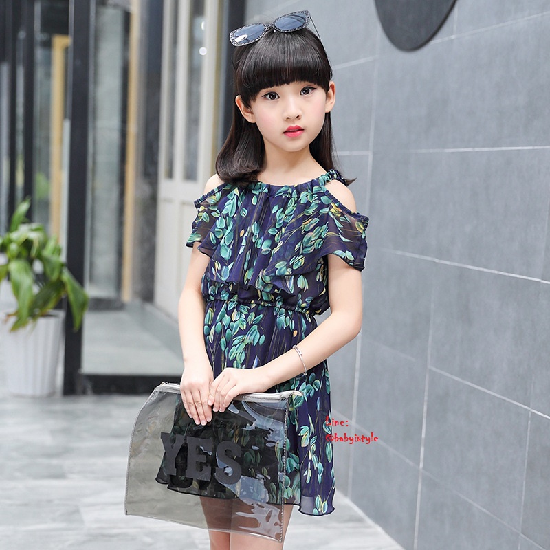 เด็กโต-เดรสเปิดไหล่สีกรมท่า ลายใบไม้ ช่วงเอวยางยืด มีซับในตั้งแต่ช่วงเอวลงมา ผ้าพริ้วสวยน่ารักมากๆ ไซส์ 140/150/160