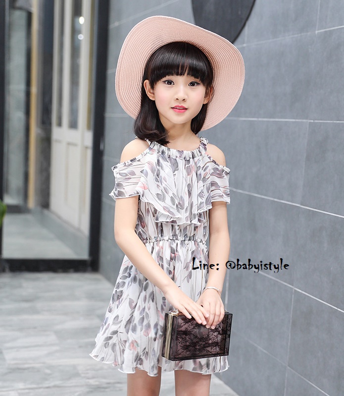 เด็กโต-เดรสเปิดไหล่สีขาวลายใบไม้ ช่วงเอวยางยืด มีซับในตั้งแต่ช่วงเอวลงมา ผ้าพริ้วสวยน่ารักมากๆ ไซส์ 140/150/160