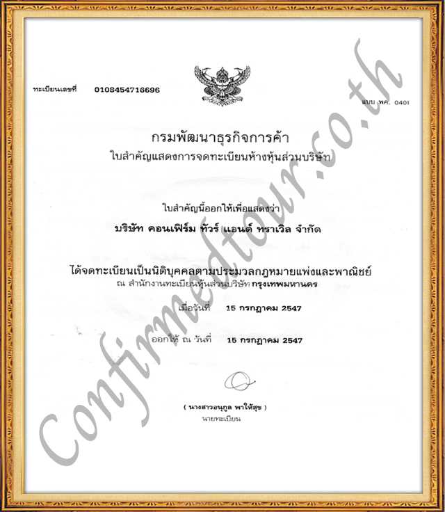 บริษัท คอนเฟิร์ม ทัวร์ แอนด์ ทราเวิล จำกัด เป็นบริษัทฯ ที่ดำเนินธุรกิจด้านการท่องเที่ยว โดยได้รับใบอนุญาตประกอบธุรกิจนำเที่ยว จากสำนักพัฒนาการท่องเที่ยว ใบอนุญาตประกอบธุรกิจนำเที่ยว เลขที่ 11/06381 นายทะเบียนธุรกิจนำเที่ยวและมัคคุเทศก์กลาง ได้ออกใบอนุญาตให้กับ บริษัท คอนเฟิร์ม ทัวร์ แอนด์ ทราเวิล จำกัด เมื่อวันที่ 27 ธันวาคม 2553 ประเภท OUTBOUND โดยวางหลัก ประกันจำนวนเงิน 200,000 บาท (สองแสนบาทถ้วน) บริษัทฯ สามารถประกอบธุรกิจนำเที่ยวได้ ทั้งในประเทศ และต่างประเทศ