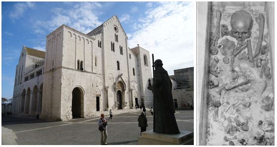 และโครงกระดูก (ที่เชื่อว่าเป็น) ของนักบุญนิโคลัส ที่ห้องใต้ดินของมหาวิหาร