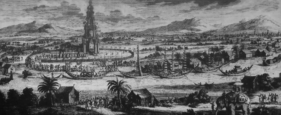 “ข้าพเจ้าได้เห็นพระเจ้าแผ่นดินเสด็จเที่ยวทางเรือ ทรงเรือลำใหญ่กว่าเรือใบเดินทะเล เรือลำนั้นมีปีกด้วย ทำเป็นรูปนก ทางหัวเรือตกแต่งอย่างงดงาม และมีพายปิดทอง มีเรือตามเสด็จ ๑๒ ลำ แต่ไม่มีราชบัลลังก์ในนั้น เพราะฉะนั้นเมื่อพระเจ้าแผ่นดินเสด็จลงประทับเรือเมื่อใด คนอื่นก็จะต้องหมอบลง”
