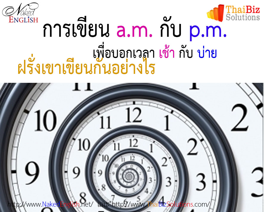 การบอกเวลาช่วงก่อนเที่ยงและหลังเที่ยงในภาษาอังกฤษ ฝรั่งเขาจะใช้ตัวย่อว่า a.m. กับ p.m. แต่ที่คนไทยเราส่วนใหญ่มักจะงงก็คือว่า เราควรจะเขียนมันด้วยตัวพิมพ์เล็กทั้งสองตัว หรือตัวพิมพ์ใหญ่ทั้งสองตัว แล้วมันควรจะมีจุดคั่นหรือเปล่า หรืออย่างไรกันแน่ ถ้าคุณไปให้ฝรั่งที่เขาเป็นนักวิชาการมาอธิบายเรื่องนี้ เขาก็คงจะอธิบายเรื่องมาตรฐานการบอกเวลาตามมาตรฐานของเมือง Chicago หรืออะไรต่อมิอะไรอีกหลายอย่างซึ่งมันก็อาจจะทำให้เรางงกันเข้าไปใหญ่ เอาเป็นว่าผมขอสรุปให้คุณฟังง่ายๆ แบบนี้นะครับ การเขียน a.m. กับ p.m. เ...