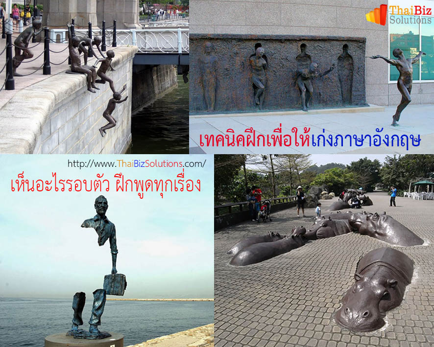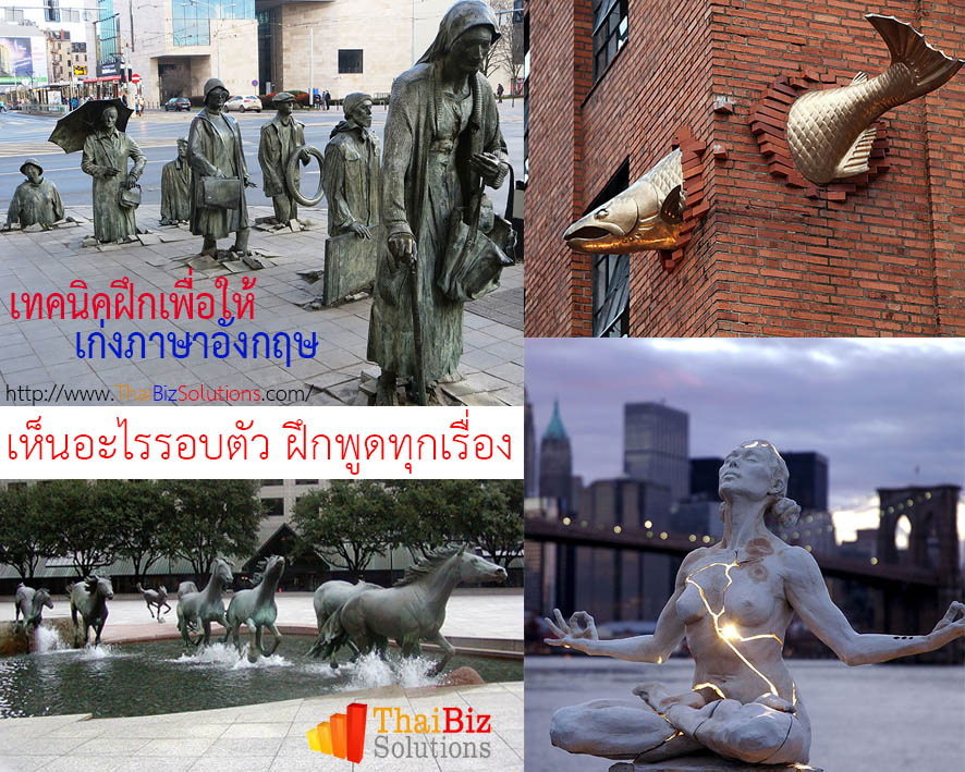 มาฝึกคิดและฝึกพูดหรือเขียนภาษาอังกฤษจากชีวิตประจำวันกันต่อนะครับ ผมจะให้คุณดูสถานที่อีก 4 แห่ง ที่มีรูปปั้นที่ดูมีความคิดสร้างสรรค์อย่างมากๆ ในประเทศต่างๆ รอบโลกกันต่อครับ I’m going to show you another 4 of the most creative statues from around the world. รูปแรกในวันนี้ (บนซ้าย) ก็คือ “(วิถีชีวิต)ผู้คนที่ใช้ชีวิตอยู่กับแม่น้ำ โดยศิลปินชื่อ ชองฟาเชียง” ในประเทศสิงคโปร์ The first one (upper left) is “People of The River” by Chong Fah Cheong”, in Singapore. รูปที...