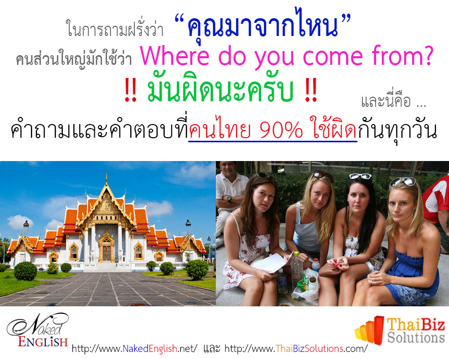 เวลาคุณจะถามชาวต่างชาติว่า “คุณมาจากประเทศอะไร” หรือ “คุณมาจากไหน” คุณควรจะถามว่า Where are you from? …… ไม่ใช่ Where do you come from? การถามว่า Where do you come from? มันหมายถึงว่า คุณเป็นคนพื้นเพที่ไหน โดยดูจากเทือกเขาเหล่ากอของคุณเนี่ย คุณเป็นคนที่มีหัวนอนปลายเท้ามาจากไหน ซึ่งหัวใจหรือความหมายหลักของการถามและการตอบแบบนี้ ก็คือ เป็นการถามถึง “หัวนอนปลายเท้า” ว่าคุณเป็นคนพื้นเพที่ไหน และคำตอบก็อาจจะเป็นได้ว่า “ฉันเป็นคนที่มีพื้นเพ มาจากเ...