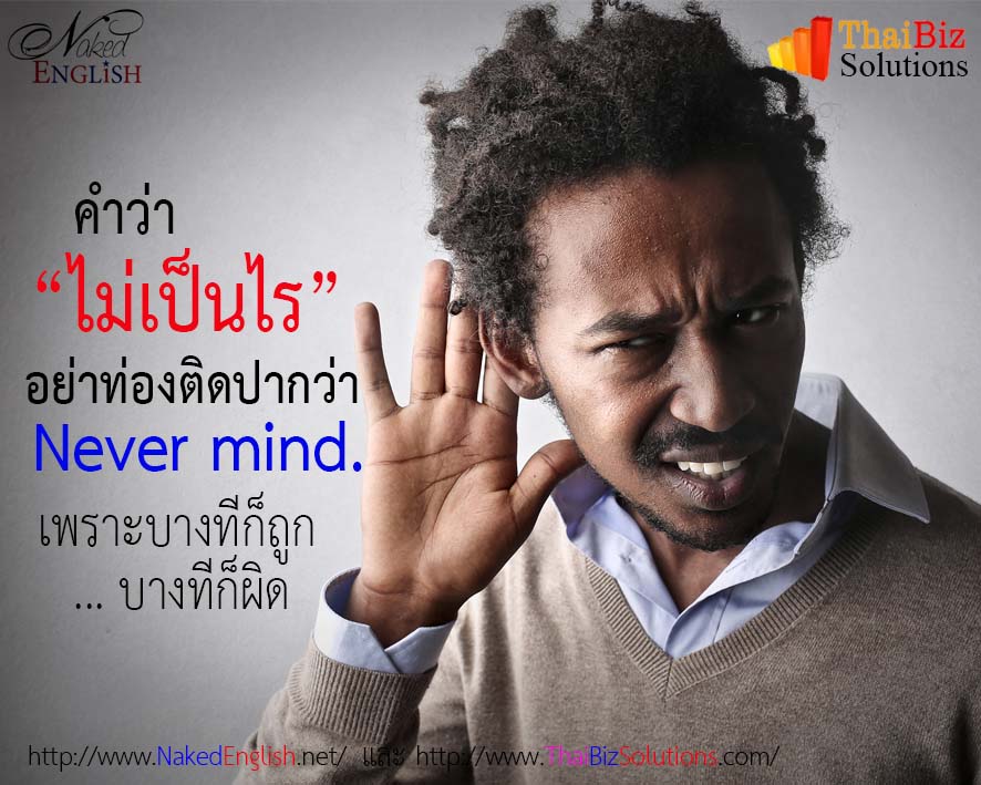คำว่า “ไม่เป็นไร” อย่าท่องจนติดปากว่า “Never mind.” แค่เพียงประโยคเดียวนะครับ เพราะจริงๆแล้วประโยคที่ว่า “ไม่เป็นไร” ในภาษาไทยของเรามันใช้ได้กับ (อย่างน้อย) 2-3 เหตุการณ์ที่แตกต่างกัน แล้วในภาษาอังกฤษเขาก็ไม่ได้ใช้คำเดิมว่า “ไม่เป็นไร” นี้ กับทุกเหตุการณ์ด้วย ดังนั้นเพื่อความถูกต้อง คุณควรจะเห็นภาพของเหตุการณ์ แล้วก็ใช้ภาษาอังกฤษให้ถูกตามภาพด้วย เพื่อการสื่อสารที่ถูกต้องนะครับ ผมจะยกตัวอย่างเหตุการณ์ง่ายๆ ในคุณได้คิดเป็นภาพแล้วจำประโยคไปใช้ให้ถูกต้...