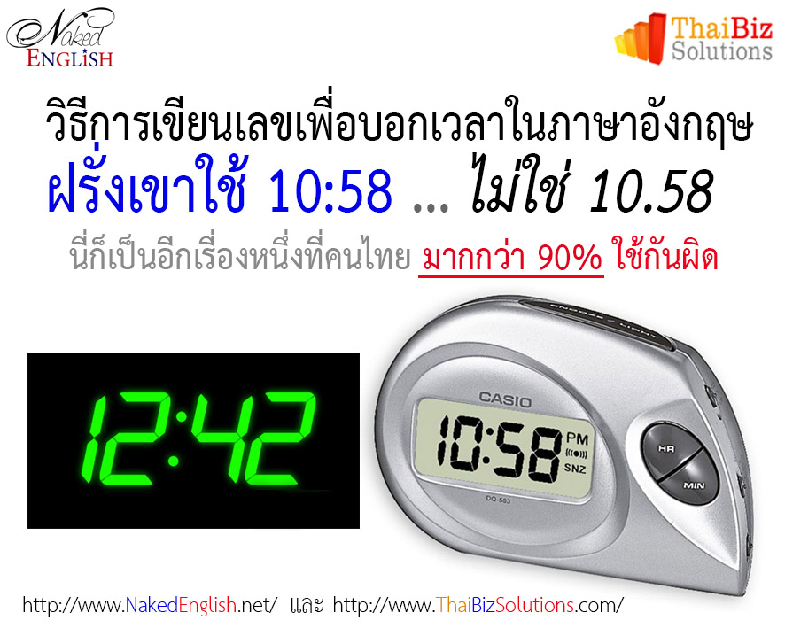การเขียนเลขบอกเวลาที่คนไทย > 90% ใช้ผิด การเขียนเลขในระบบดิจิตอลตามระบบสากลนั้น เขาใช้เครื่องหมาย colon ( : ) เป็นตัวกั้นระหว่างเลข “ชั่วโมง” กับ “นาที” และ “วินาที” เครื่องหมาย colon ที่ว่านี้ เขาเอาไว้ใช้สำหรับเลขฐาน 60 (แปลว่ามีเลขที่อยู่ในเครือข่ายของมันอยู่ 60 ตัว คือจากเลข 0 ถึง 59 หรือจะอธิบายให้ฟังแบบง่ายๆ ก็คือใน “หนึ่งชั่วโมง” มี 60 นาที; และใน “หนึ่งนาที” มี 60 วินาที) พูดง่ายๆก็คือว่า เขาใช้เครื่องหมาย colon เป็นตัวคั่นระ...