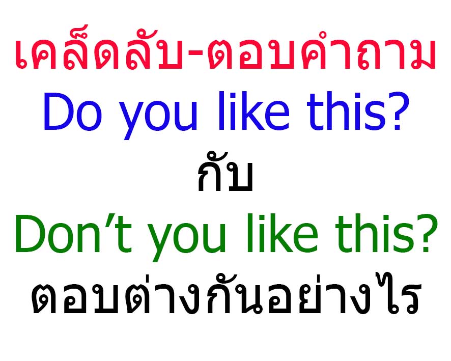 เคล็ดลับการตอบคำถามภาษาอังกฤษที่ถูกต้อง ไม่ว่าฝรั่งเขาจะถามคำถามมาเป็นแบบมีคำว่า “Not” หรือ ไม่มีคำว่า “Not” ก็ตาม ถ้าคำตอบของเราเป็นอย่างไร ก็จงตอบไปอย่างนั้น อย่าไปคิดเหมือนภาษาไทยนะครับ ยกตัวอย่างเช่น ตัวคุณไม่ชอบทานชีส (เนยแข็ง) เลย แล้วฝรั่งเขาถามมาว่า Do you like cheese? คุณก็จะตอบว่า No, I don’t. อันนี้ง่ายๆ ทุกคนคงทราบอยู่แล้ว แต่ถ้าเขาเกิดถามว่า Don’t you like cheese? คุณก็ยังต้องตอบว่า No, I don’t. อยู่ดี เพราะในความเป็นจริงก็คือ “คุณไม่ช...