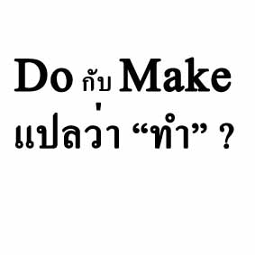 Do กับ Make แปลว่า "ทำ" ทั้งคู่ แต่ใช้ต่างกัน Do "ทำ" ที่ใช้กับ งาน การบ้าน งานบ้าน โครงงานต่างๆ เช่น 1. I have to do my homework every day. 2. Can you do these chores for me? Make "ทำ" ที่ใช้ในความหมายว่า สร้าง ผลิต หรือทำให้เกิดขึ้นมาใหม่ เช่น 1.) My mother made vegetable soup for me today. 2.) At school, I have made a lot of friends.
