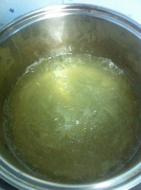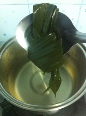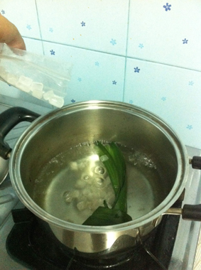 4. พอน้ำเริ่มเดือดเราก็นำใบเตยที่เราเตรียมไว้ลงต้มก่อนได้เลย พอใบเตยเริ่มส่งกลิ่นหอมๆแล้วเราก็ใส่น้ำตาลกรวด ประมาณ30-40กรัม ลงไป จากนั้นค่อยๆชิมรสชาติตามความชอบนะครับ ใครชอบหวานก็จัดเพิ่มไปเลย ส่วนใครไม่ชอบก็เอาแค่พอประมาณนะครับ