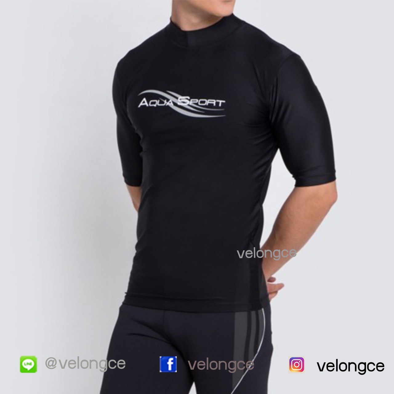 เสื้อว่ายน้ำแขนสั้น สกรีน Aqua Sport สีดำ เทา