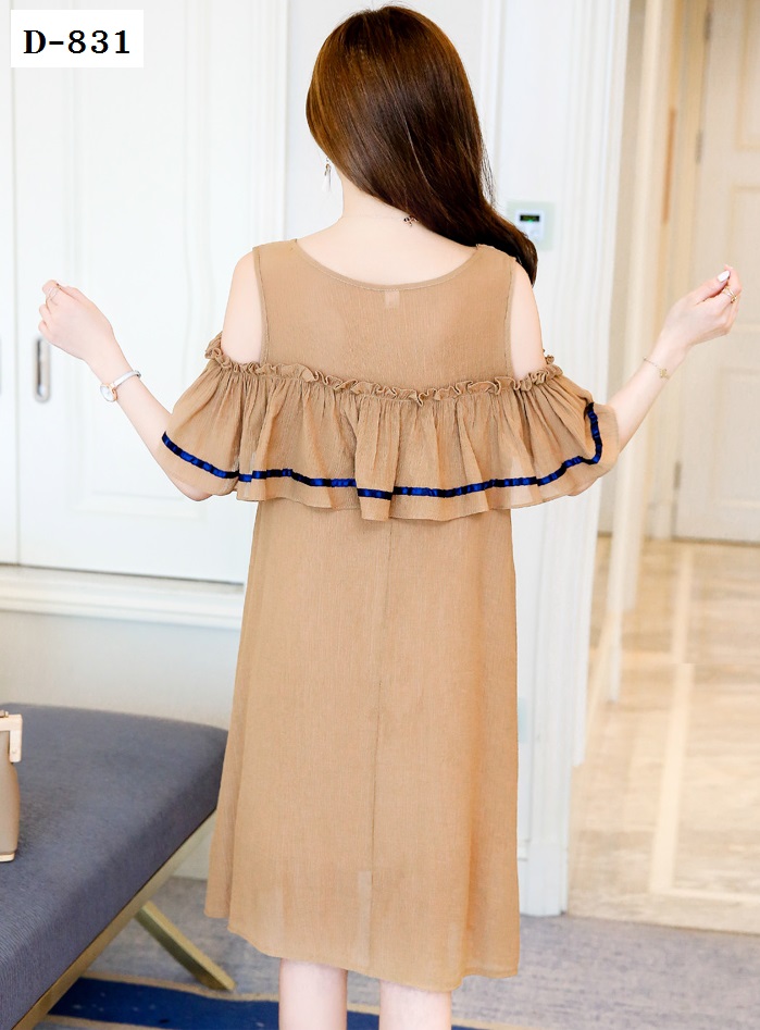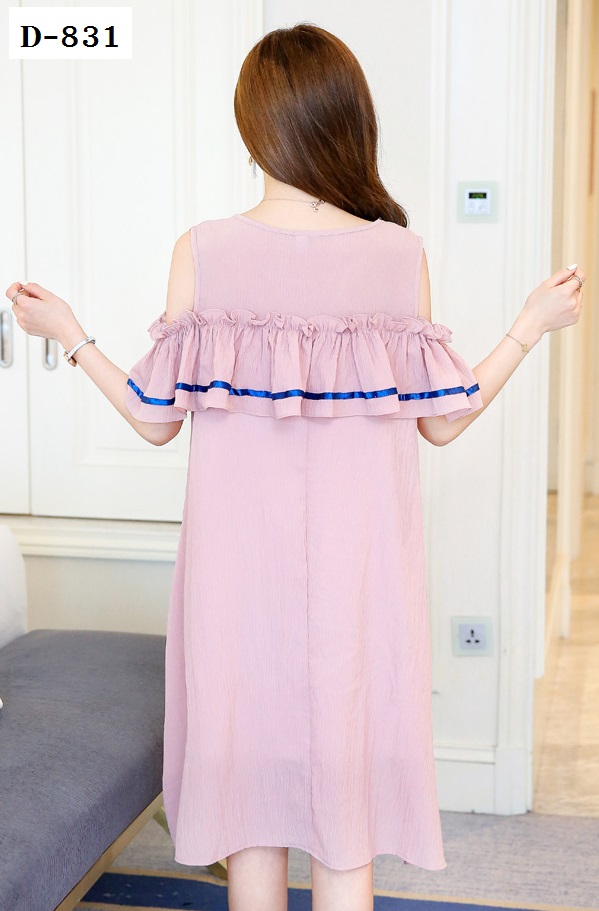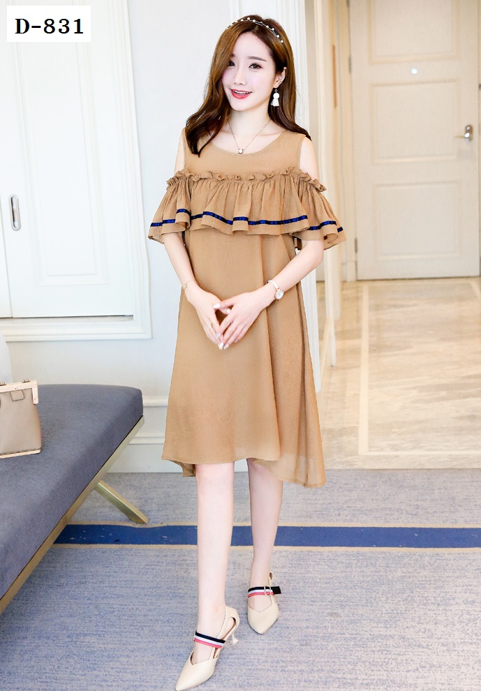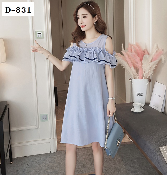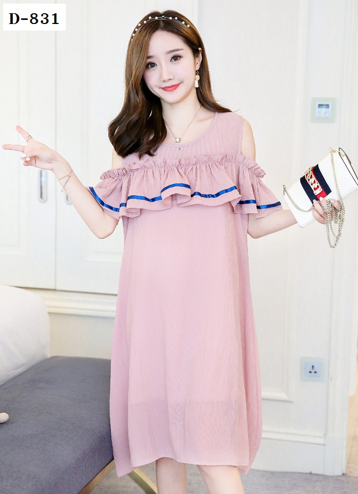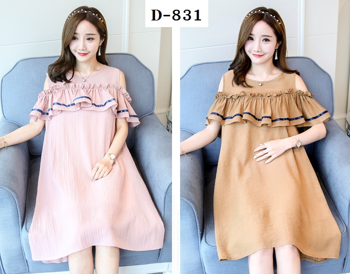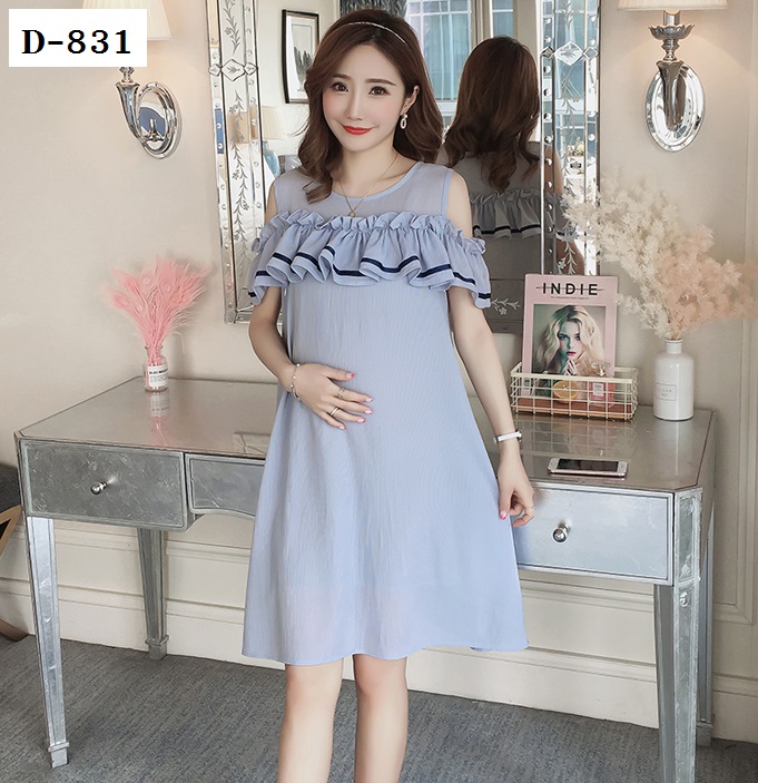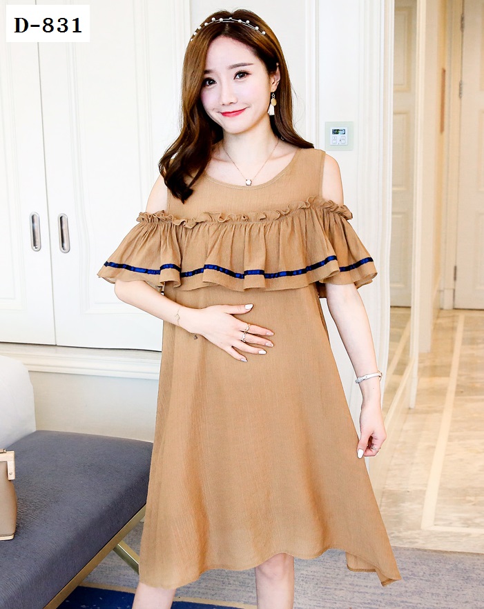 เดรสคลุมท้องแฟชั่น แต่งระบายช่วงอก โชว์ไหล่เล็กน้อย สวมใส่สบาย เปิดให้นมได้