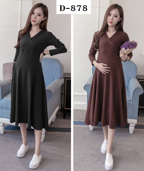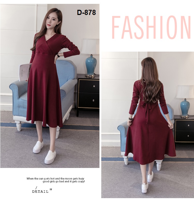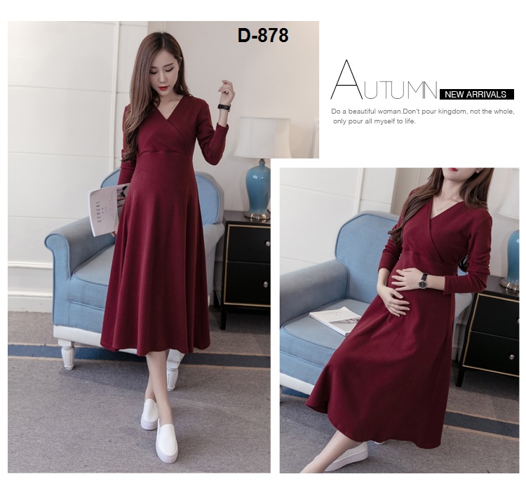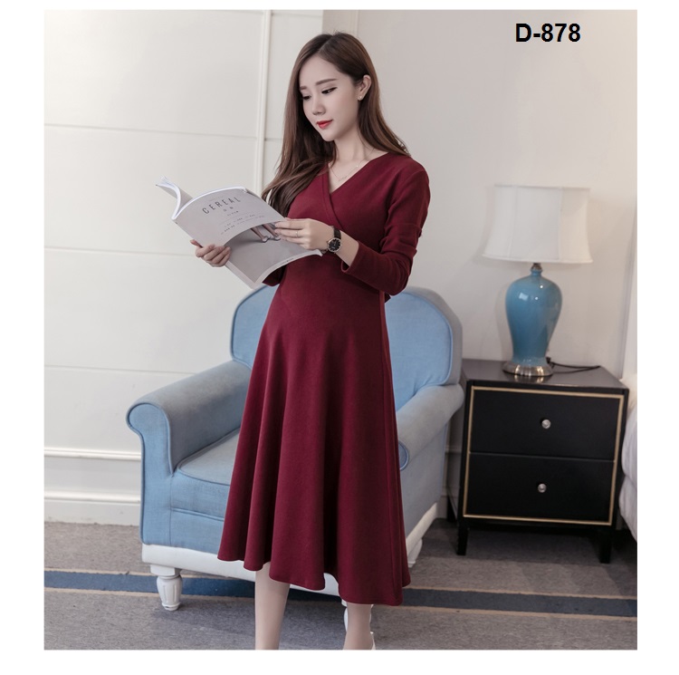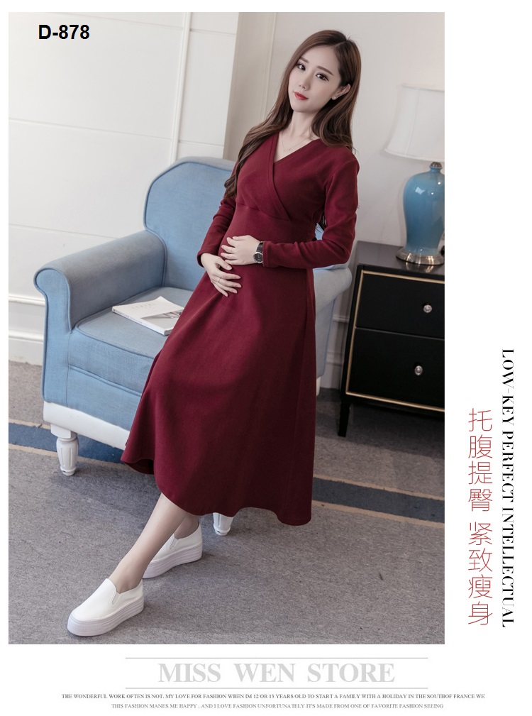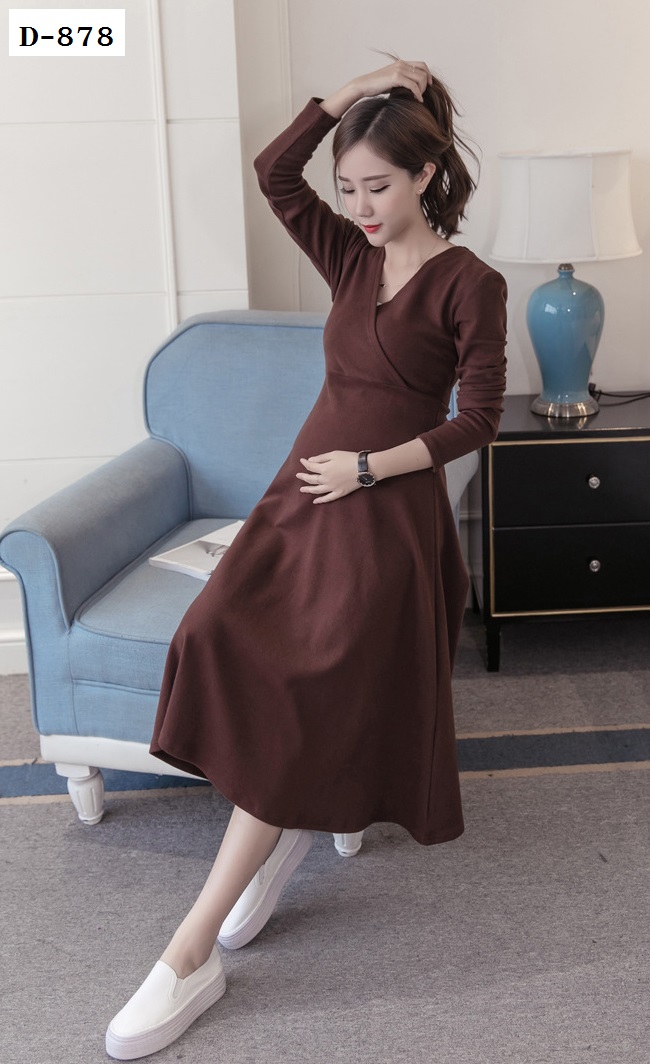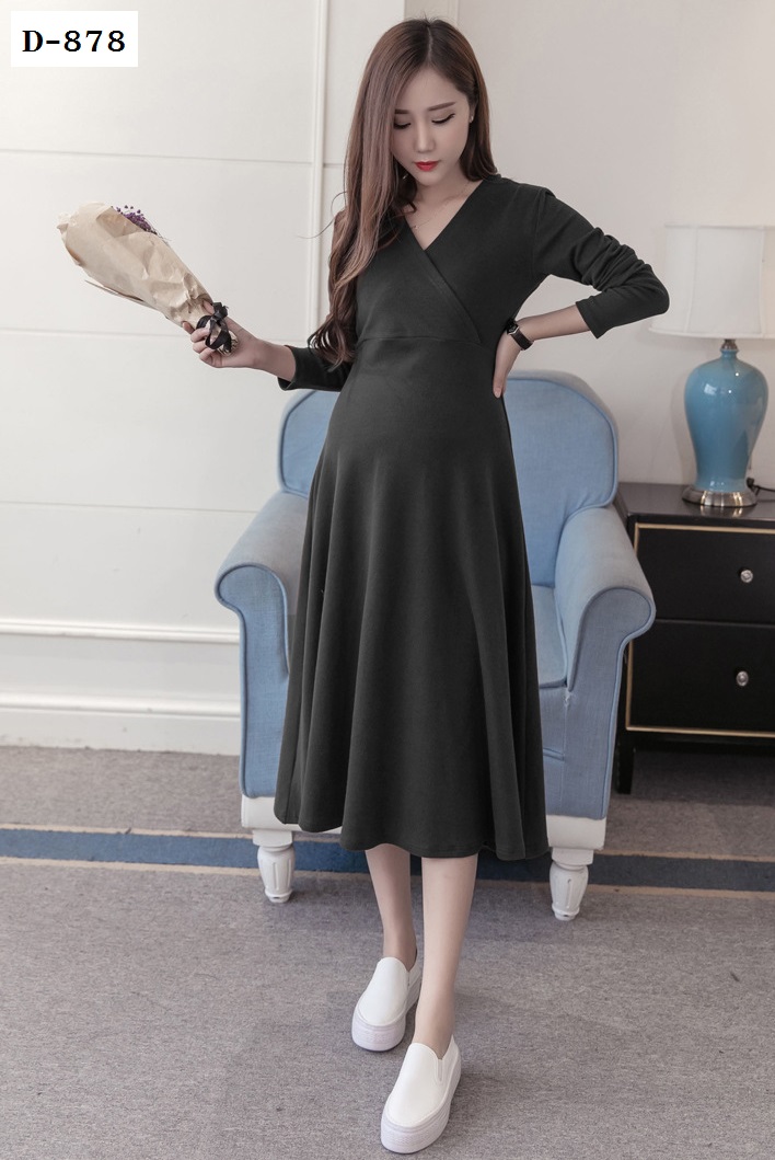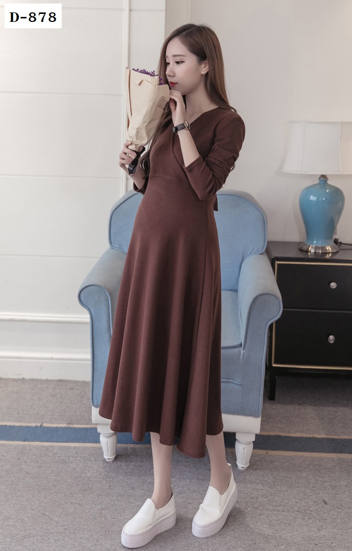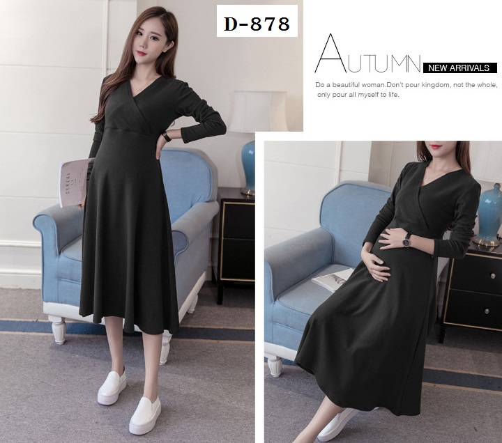 เดรสคลุมท้องแฟชั่นช่วงอกป้าย แขนยาว สวมใส่สบาย ใส่ทำงานได้