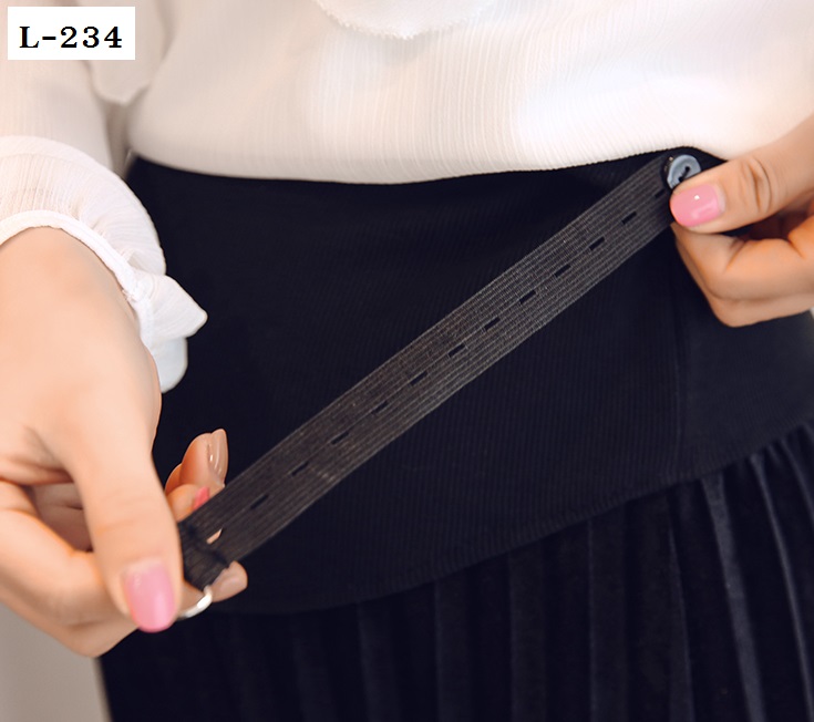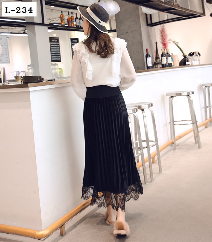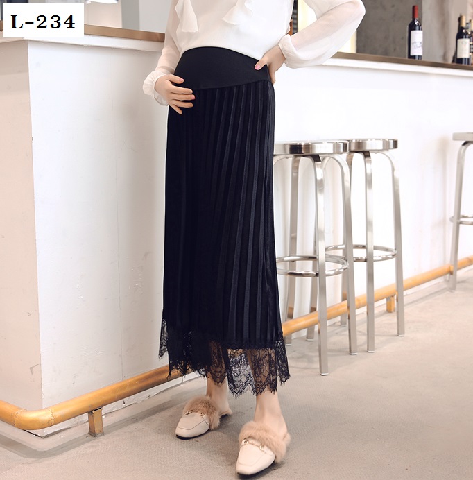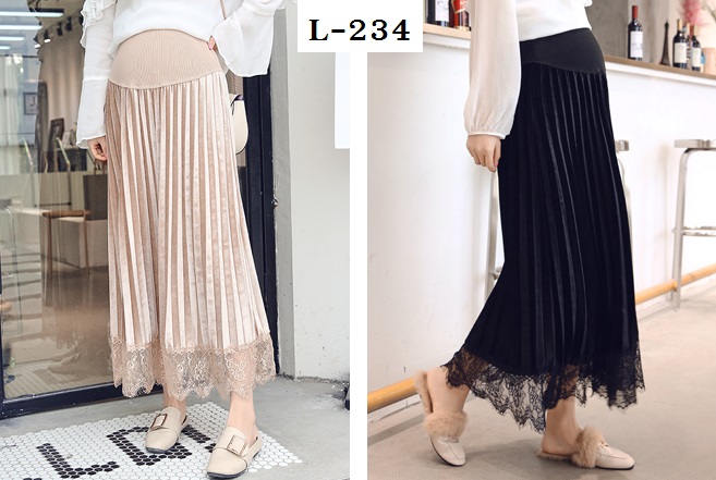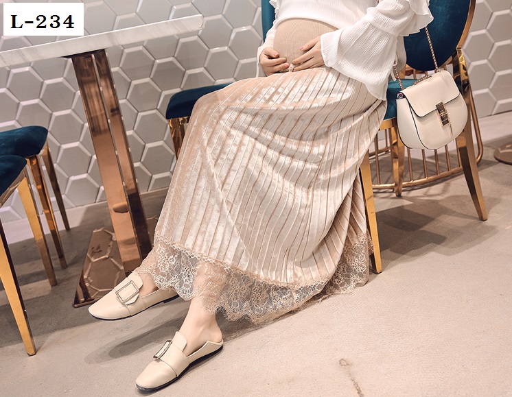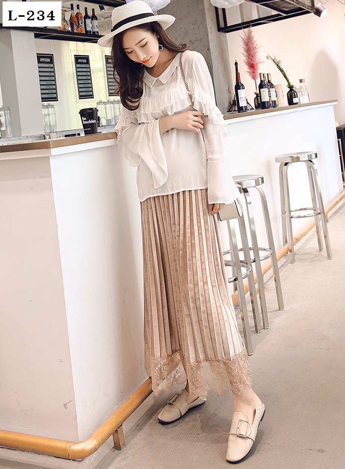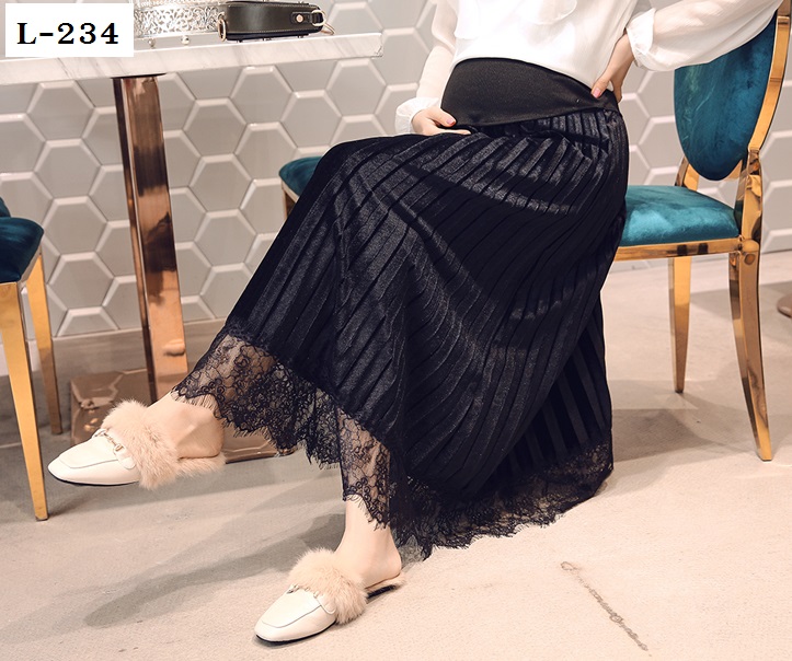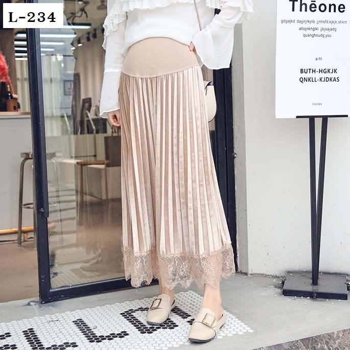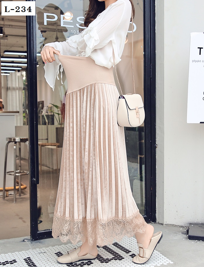 กระโปรงคลุมท้องแฟชั่น ผ้ากำมะหยี่อัดพลีท ชายต่อลูกไม้ ช่วงเอวยางยืด รูดปรับได้