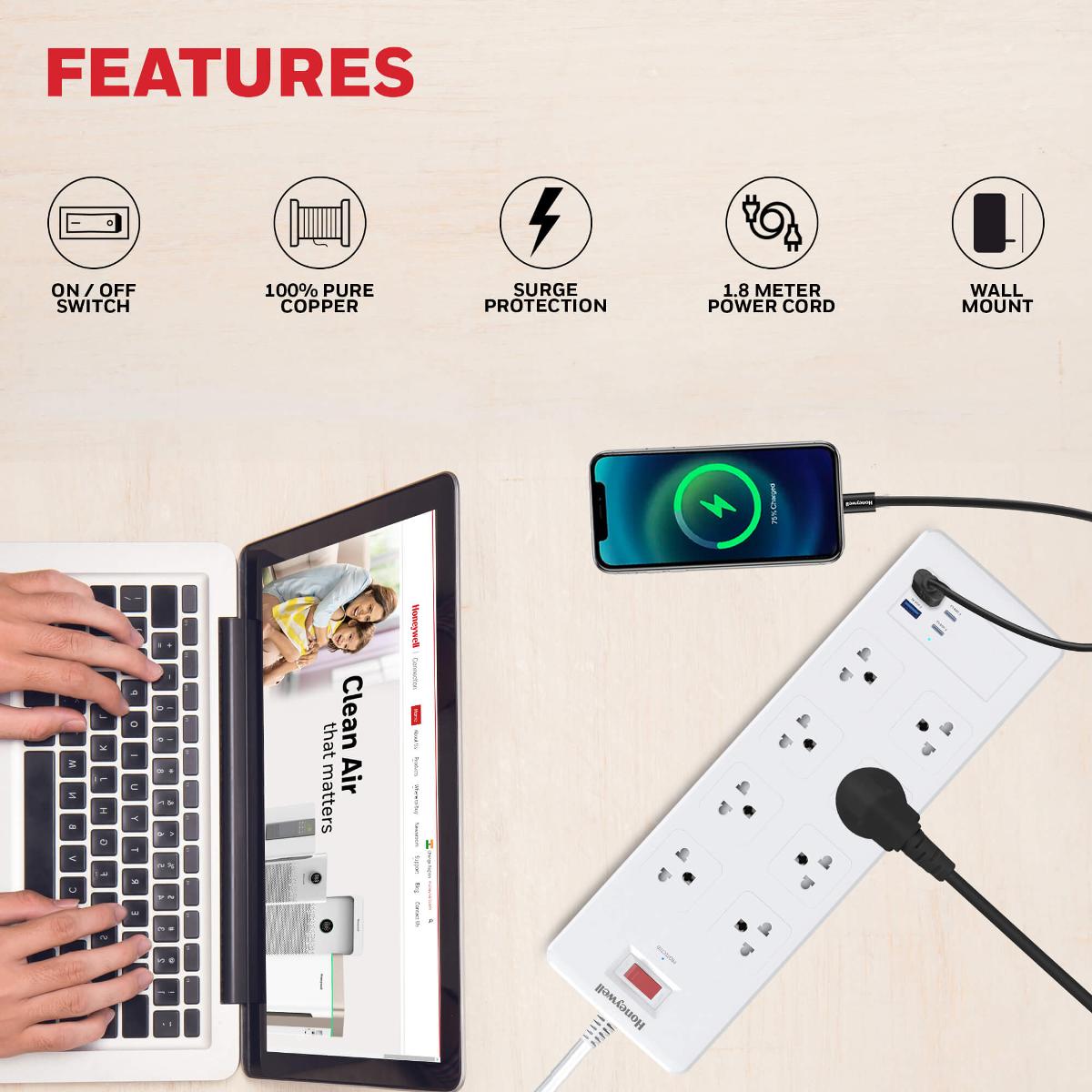 ปลั๊กไฟ 6 ช่อง Honeywell 8 Outlet Surge Protector with 2 Type C & 2 USB HC000053SRG1.8MWHT82UPD25WTH