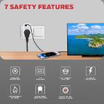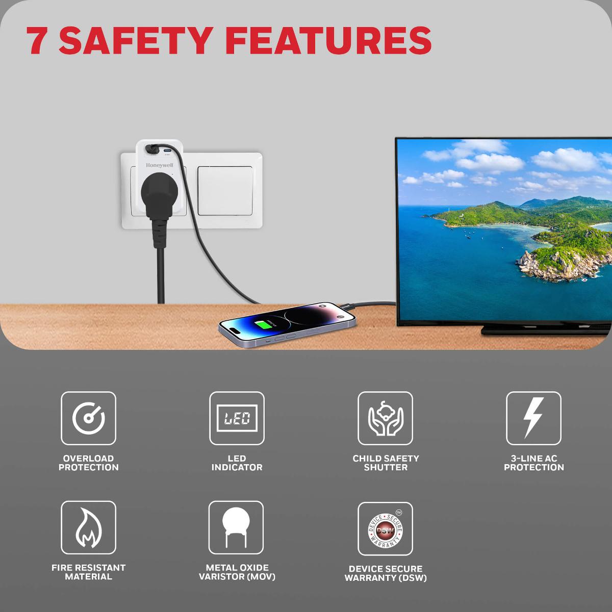 • 7 คุณสมบัติความปลอดภัยขั้นสูง ด้วย ระบบการป้องกันไฟเกิน, ระบบชัตเตอร์นิรภัยสำหรับป้องกันความปลอดภัยของเด็ก, วัสดุทนทานต่อความร้อน และไฟได้เป็นอย่างดี, ระบบไฟแสดงสถานะ LED สำหรับการป้องกันไฟกระชาก, ระบบการป้องกันไฟฟ้ากระแสสลับแบบ 3 สาย, ระบบ MOV ช่วยป้องกัน และควบคุมไฟฟ้า, การรับประกันความปลอดภัย DSW ด้วยวงเงินสูงสุด 2,000 เหรียญสหรัฐ
