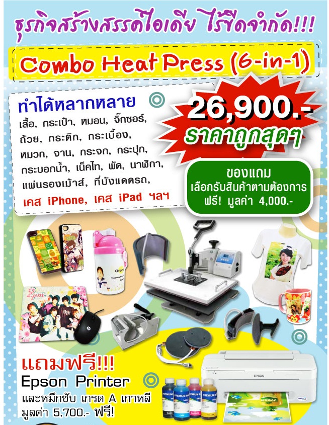 และเครื่องพิมพ์ภาพลงบนวัสดุที่หลากหลาย ไม่ว่าจะเป็น เสื้อ, แก้ว, จาน, แผ่นรองเมาส์, จิ๊กซอร์ ฯลฯ